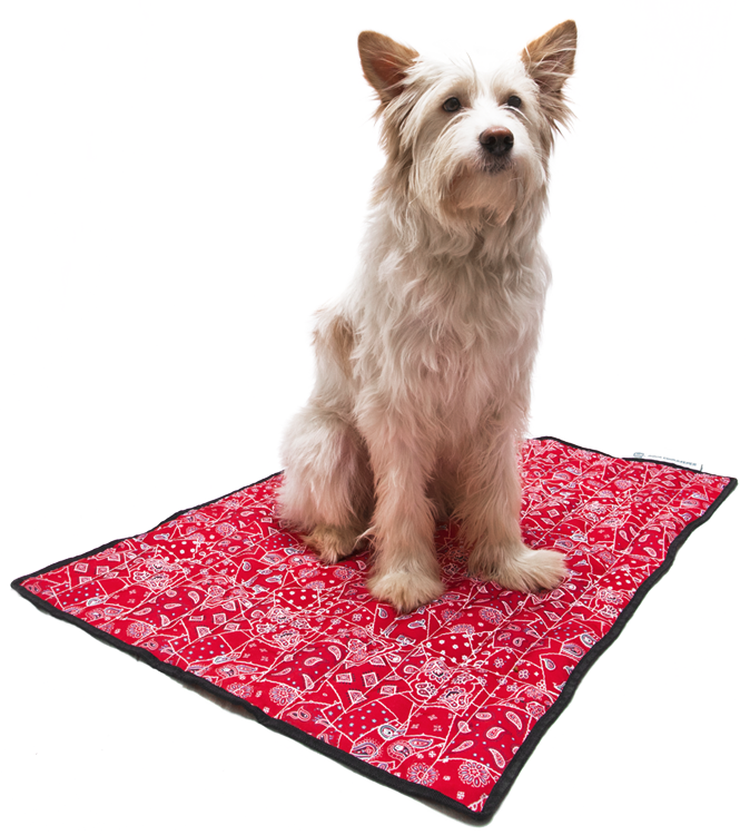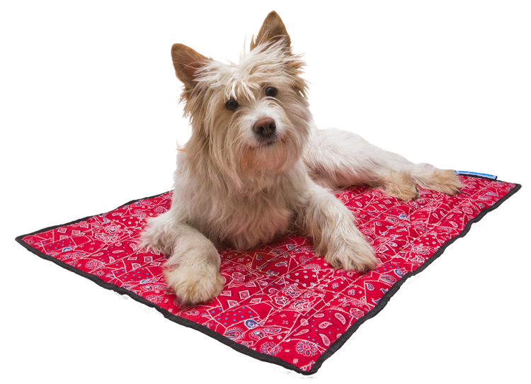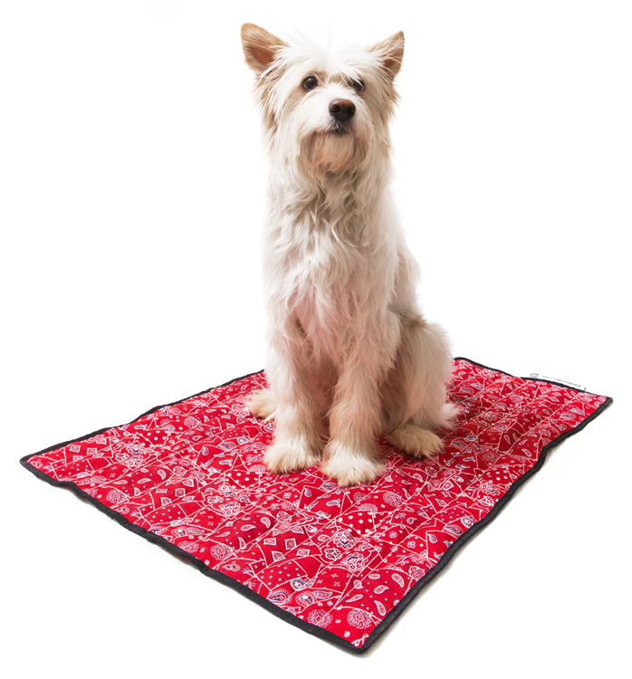 Red cooling blanket for dogs and other pets that cools your dog or cat. The cooling blanket prevents overheating and cools your pet.