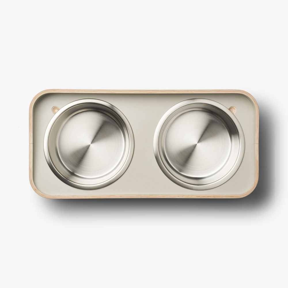 A very beautiful design feeder with double bowls in greige. With two removable stainless steel trays. Available in three sizes.