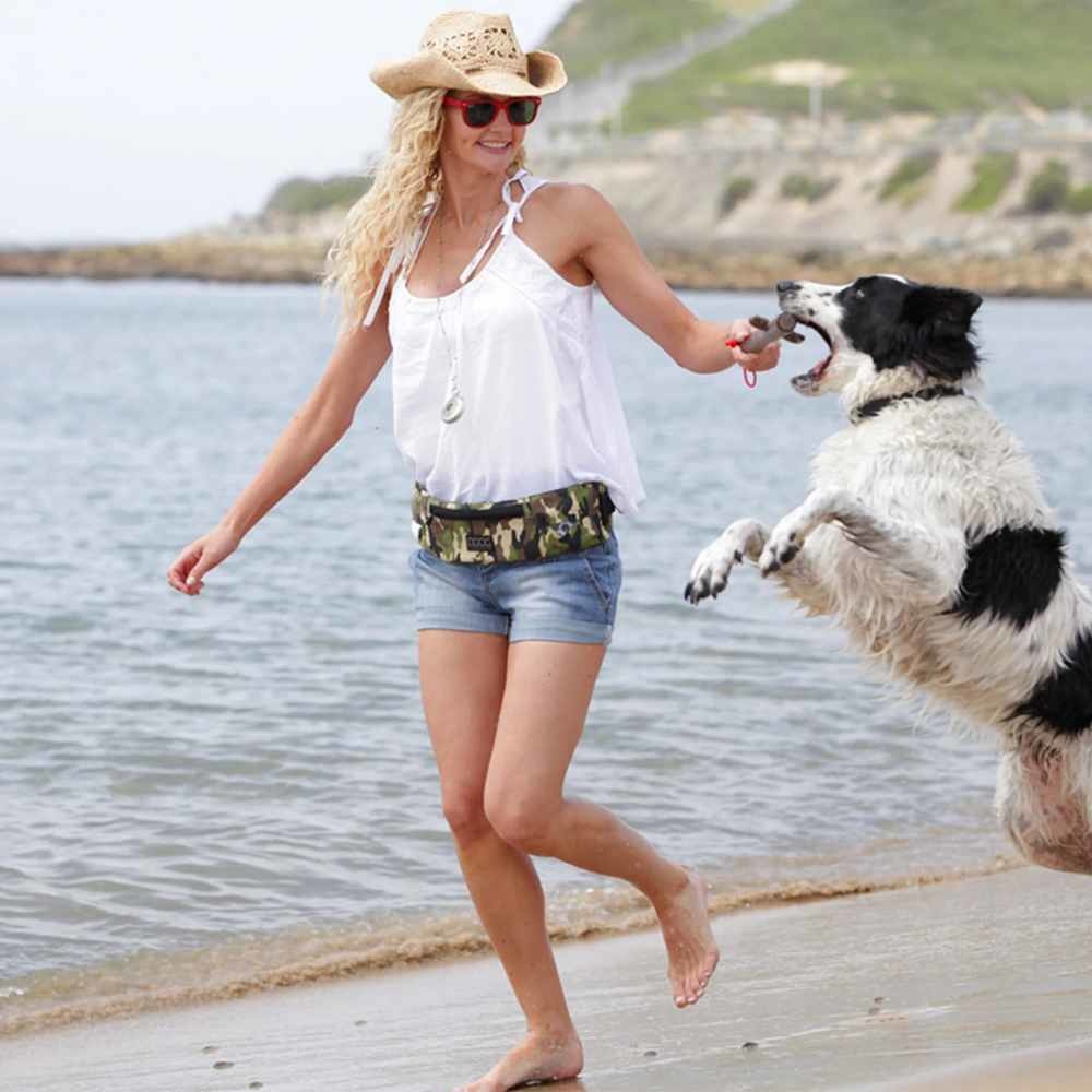 An award-winning camouflage waist bag with three storage compartments, two carabiners to leash a small dog, a poop bag pocket and a Velcro closure to store a ball. In blue with red accents.