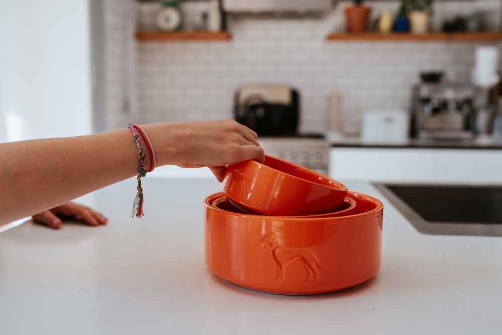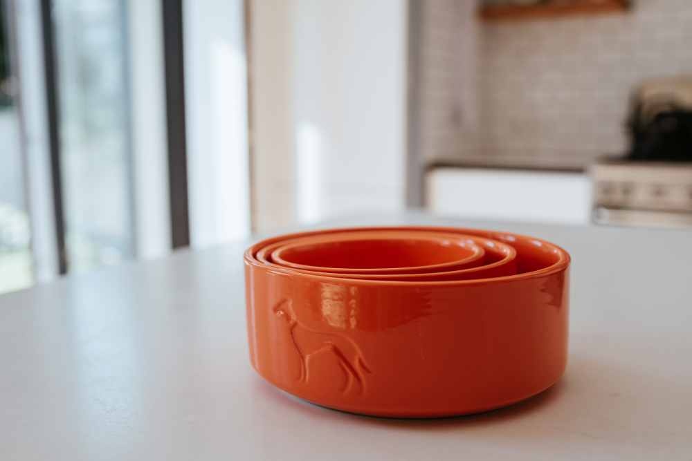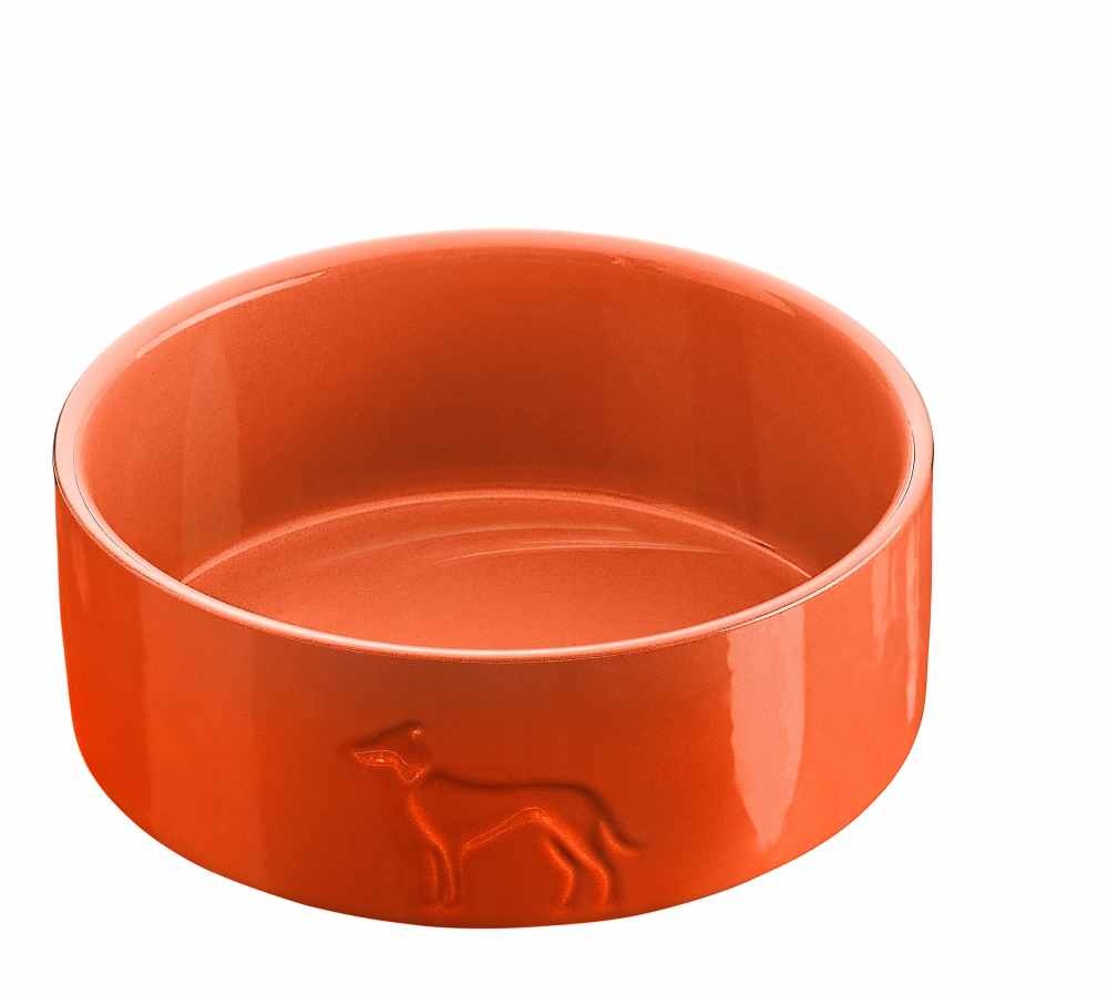 A stylish ornange drinking or feeding bowl, in a beautiful design, suitable for dogs and cats, made of glazed ceramic. Available in different sizes.