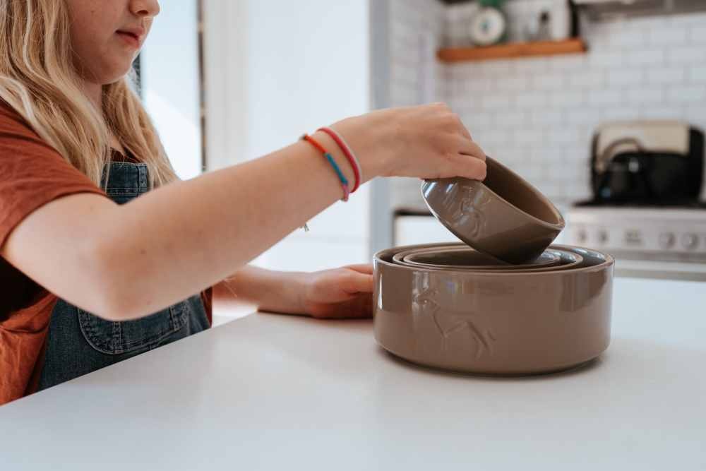 A stylish brown drinking or feeding bowl, in a beautiful design, suitable for dogs and cats, made of glazed ceramic. Available in different sizes.