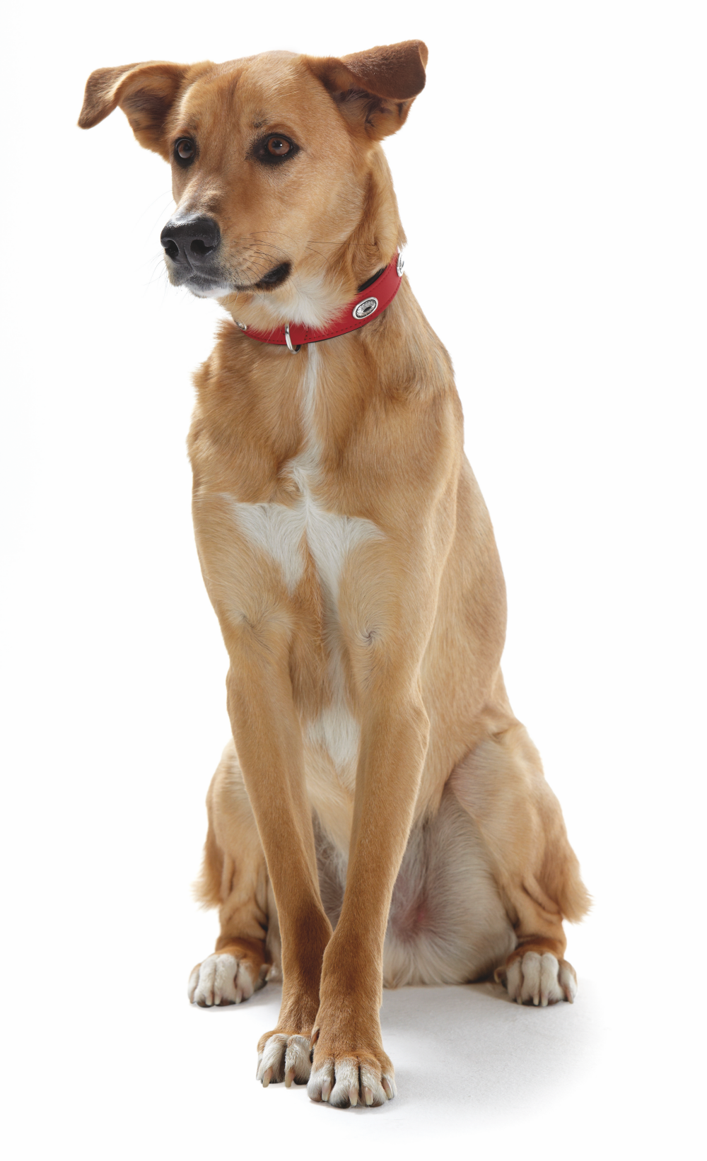 A solid red dog collar made of easy-care soft artificial leather. The collar is beautifully decorated with round elements. Available in many sizes.