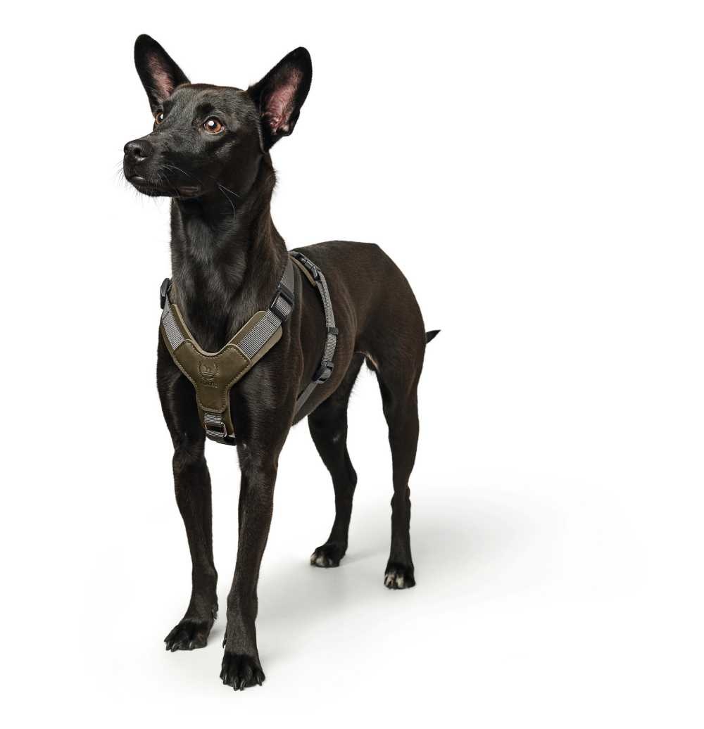 A green nylon Y dog harness lined with supple leather on the back and chest, with an excellent fit that can be adjusted in five places.