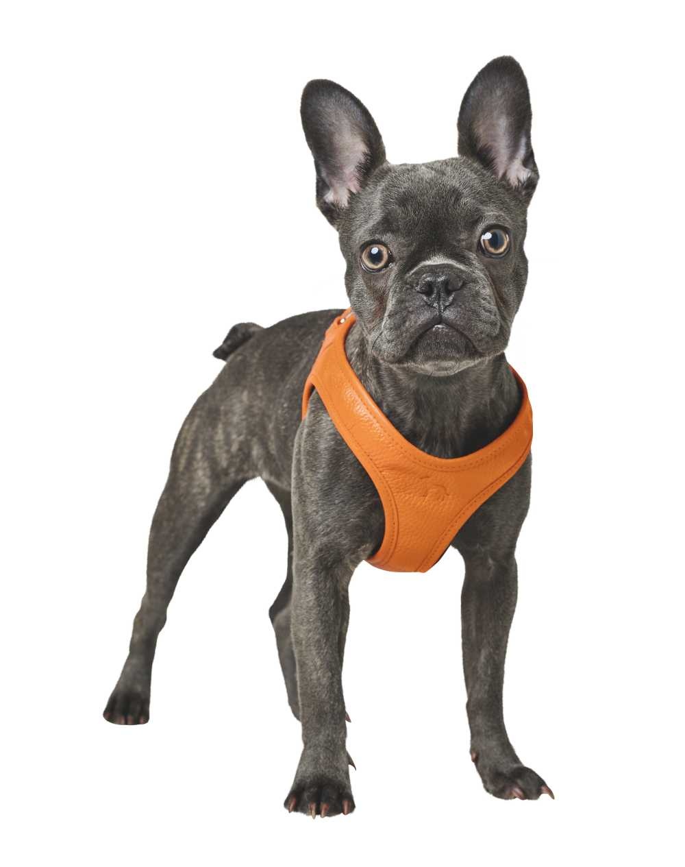 An innovative orange dog harness that is made of soft leather that is lined with breathable mesh material. Available in various sizes.
