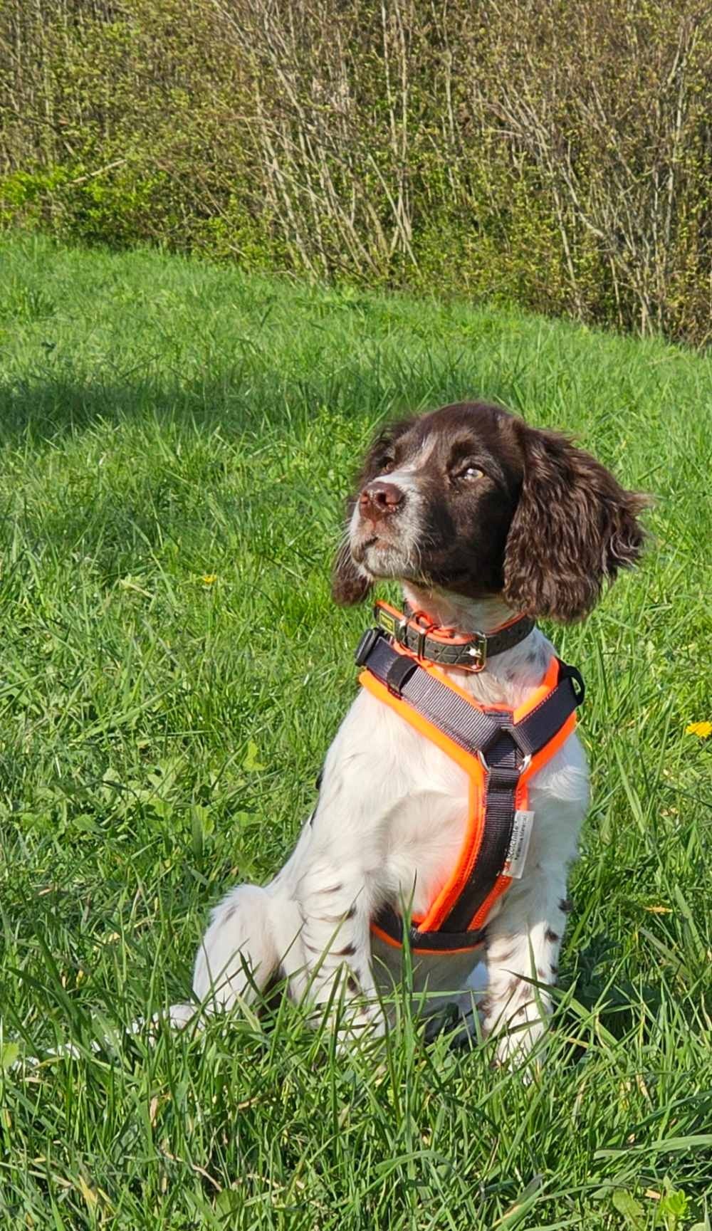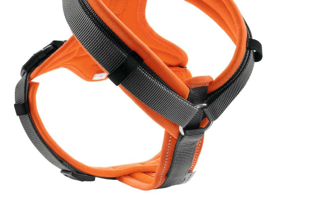 A padded orange Y dog harness with an excellent fit that you can adjust in four places.