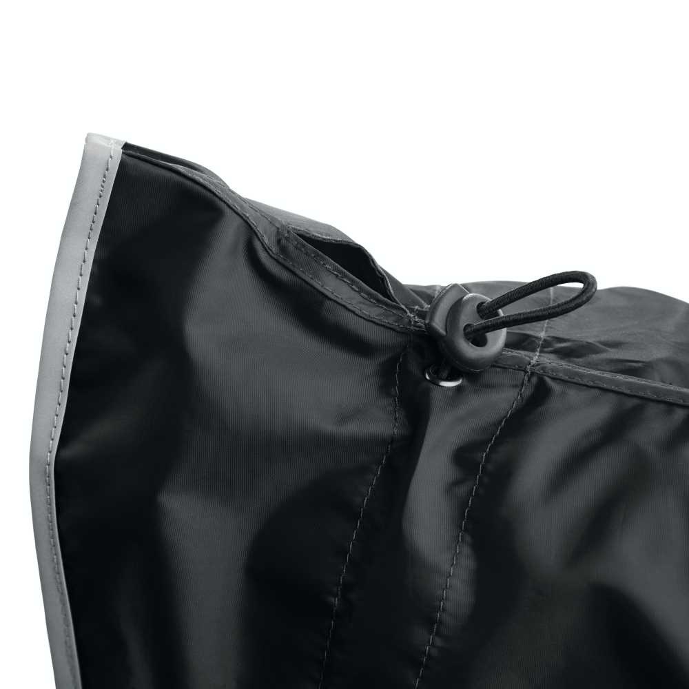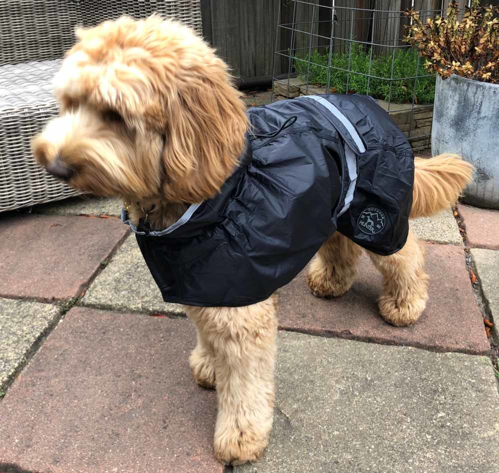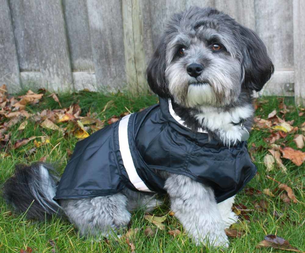 A water-repellent, windproof, black rain coat for the dog with reflective piping. Available in many sizes.