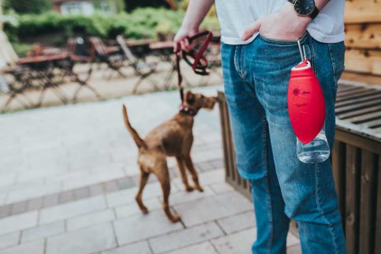 A sturdy red drinking bottle with a handy removable drinking cup for the dog.