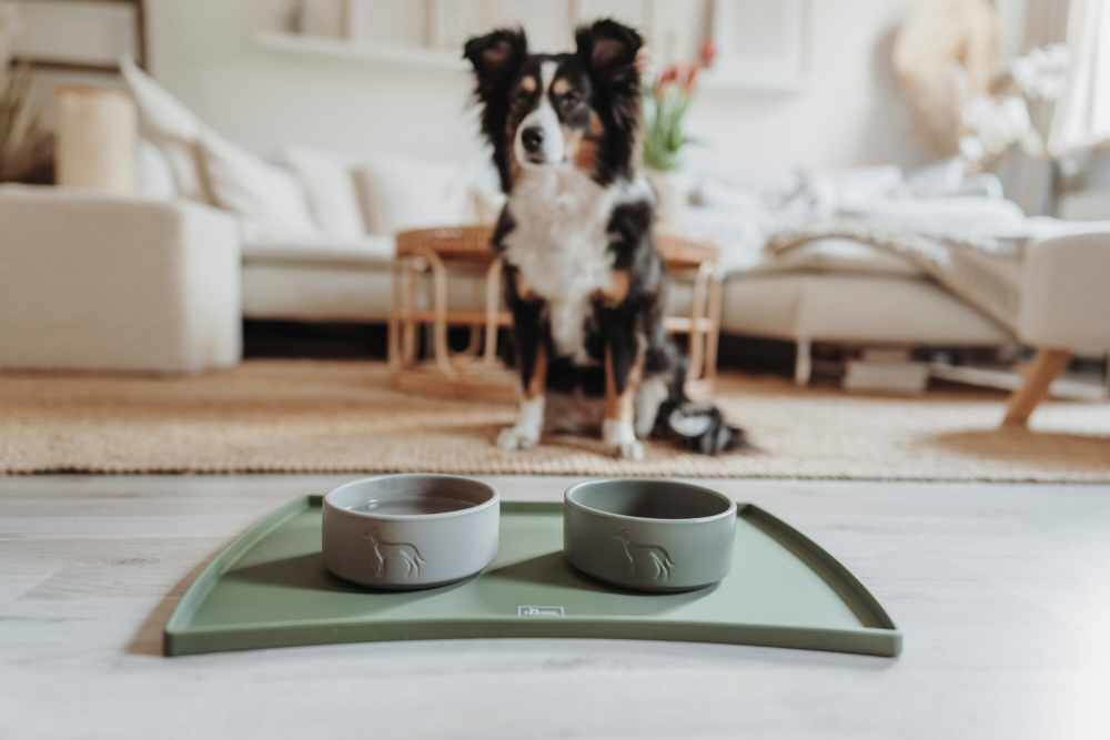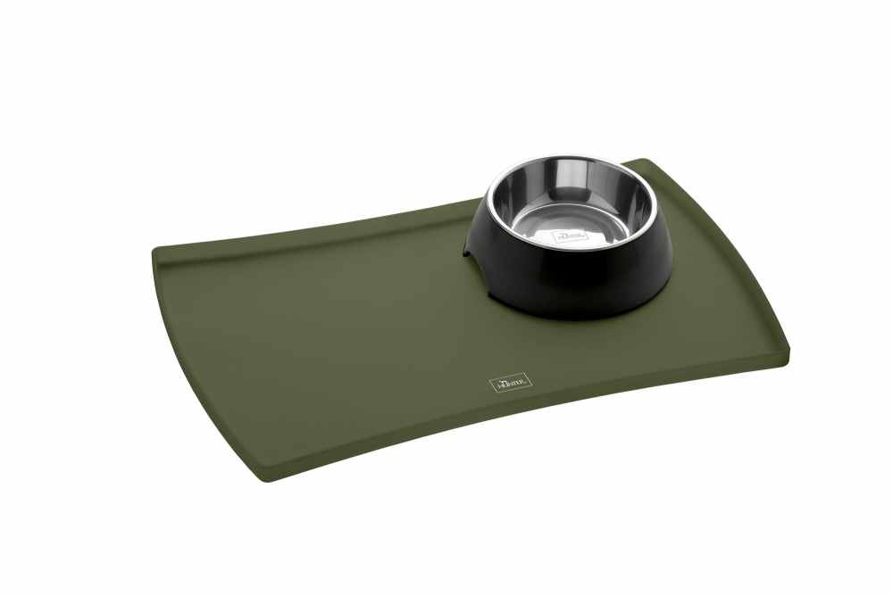 A beautiful green food bowl base with a raised edge on which the water bowl and food bowl can be placed.