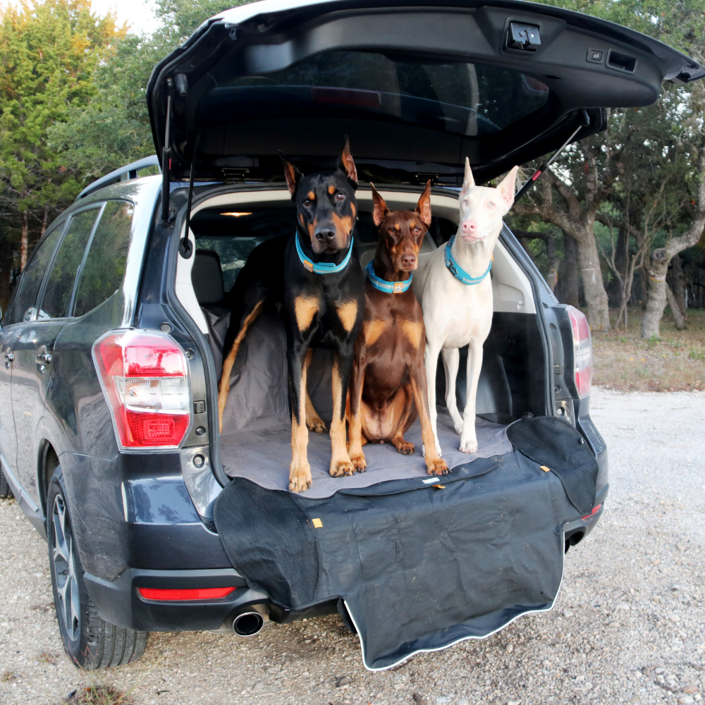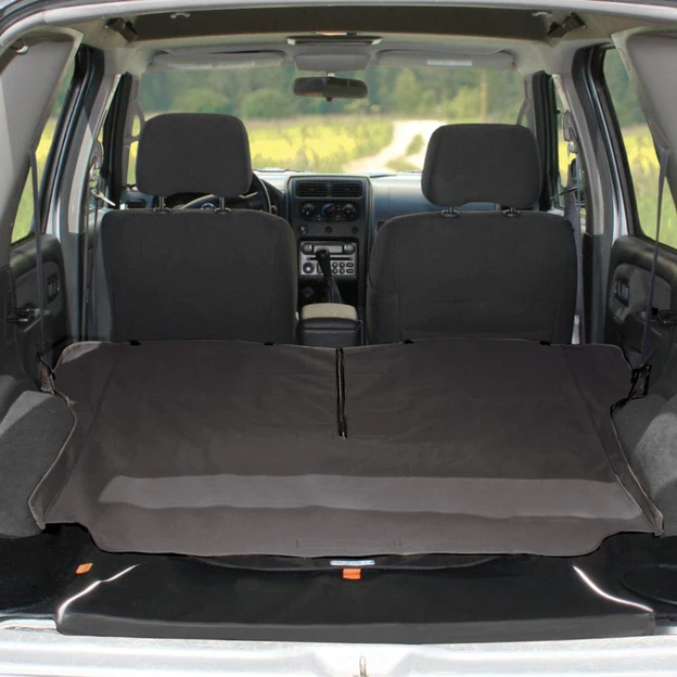 A practical gray dog blanket for the trunk of your car that protects against dirt and scratches. The blanket is waterproof and also has an extra protective flap to protect the bumper.