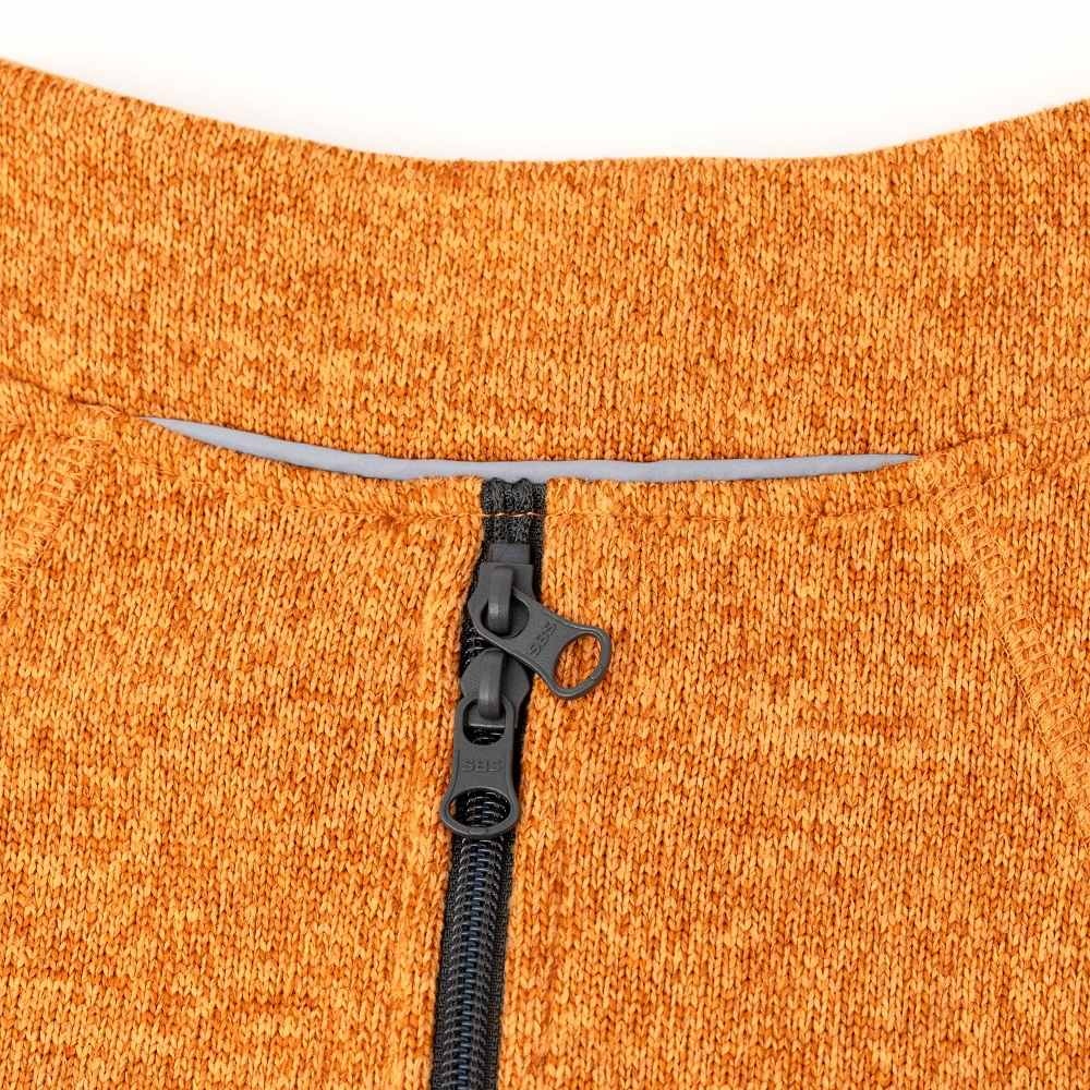 This is a soft and comfortable orange dog sweater made of 283 gr fleece. The sweater has a zipper at the neck and a Velcro closure on the chest. Available in various sizes.