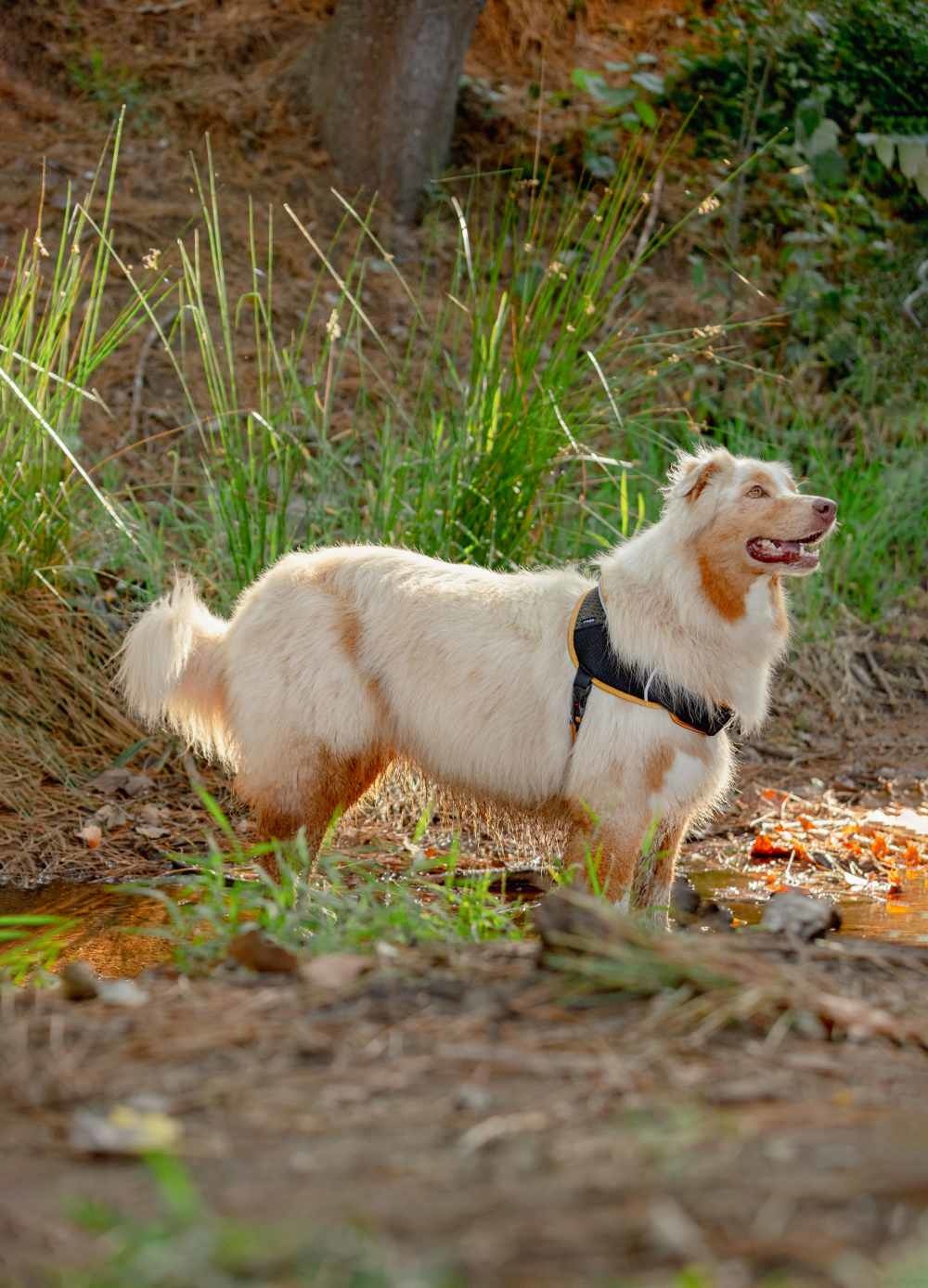 An ochre ergonomic dog harness with reflective stitching. The harness is lightweight and very comfortable for the dog and owner. Available in different sizes.