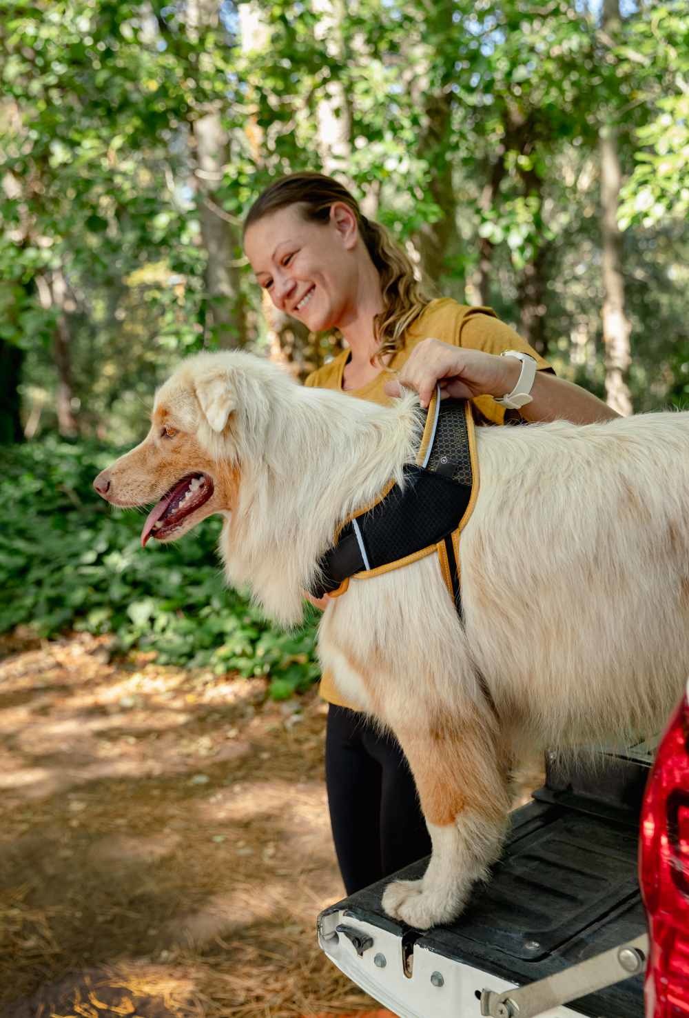 Pull the harness over the dog’s head and clip the buckle under girth. - Belay loop
