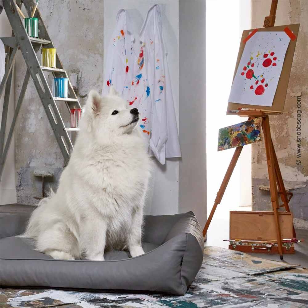 A stylish and comfortable grey artificial leather PU dog bed, in sturdy quality with a zip-off cover. The lying surface is filled with crushed memory foam and ensures optimal sleeping comfort.