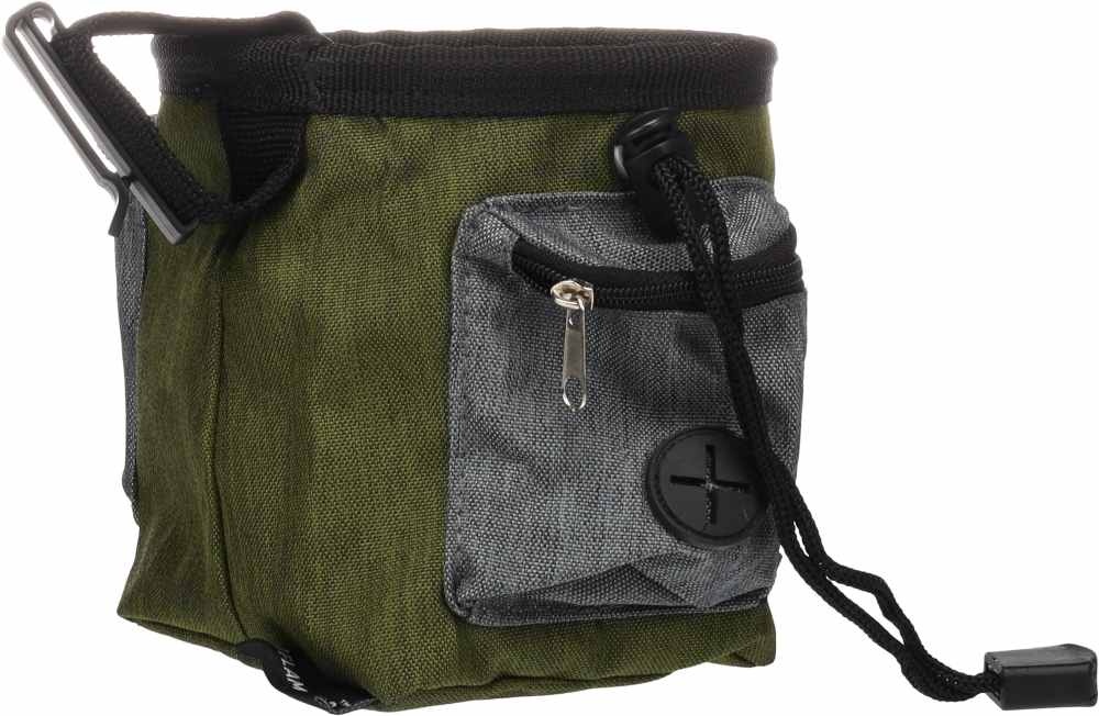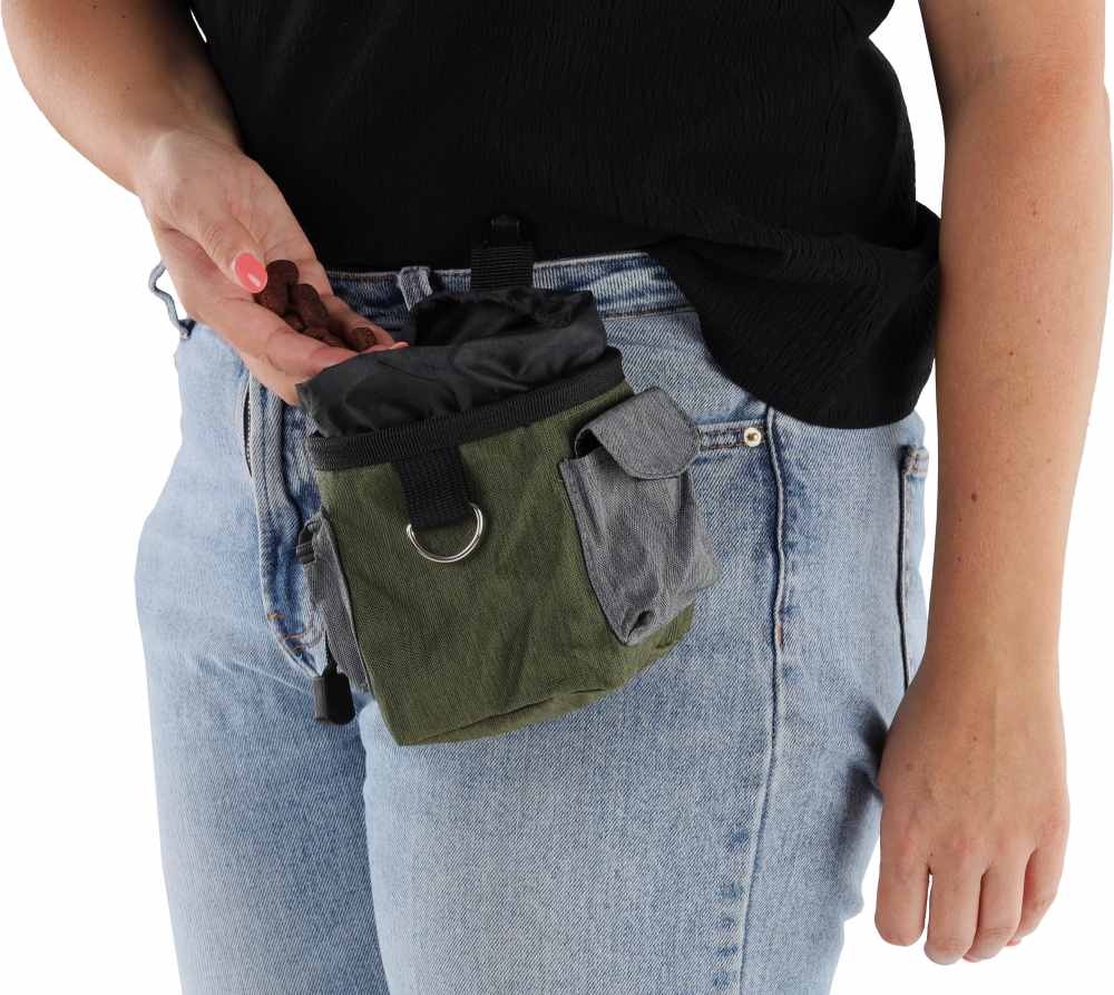 Een handige en praktische groen beloningstasje van polyester, dat ook een poepzakhouder heeft. Afmetingen 16 x 11 x 13 cm.
