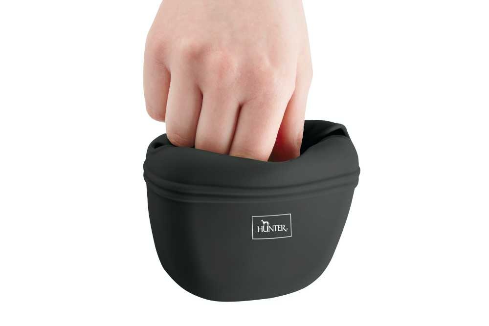 Een antraciet beloningszakje van silicone met een klip om deze vast te maken aan een riem.