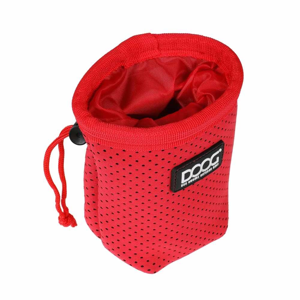 Een praktisch afsluitbaar rood beloningszakje van zacht neopreen dat gemakkelijk aan bijvoorbeeld een broekriem bevestigd kan worden.