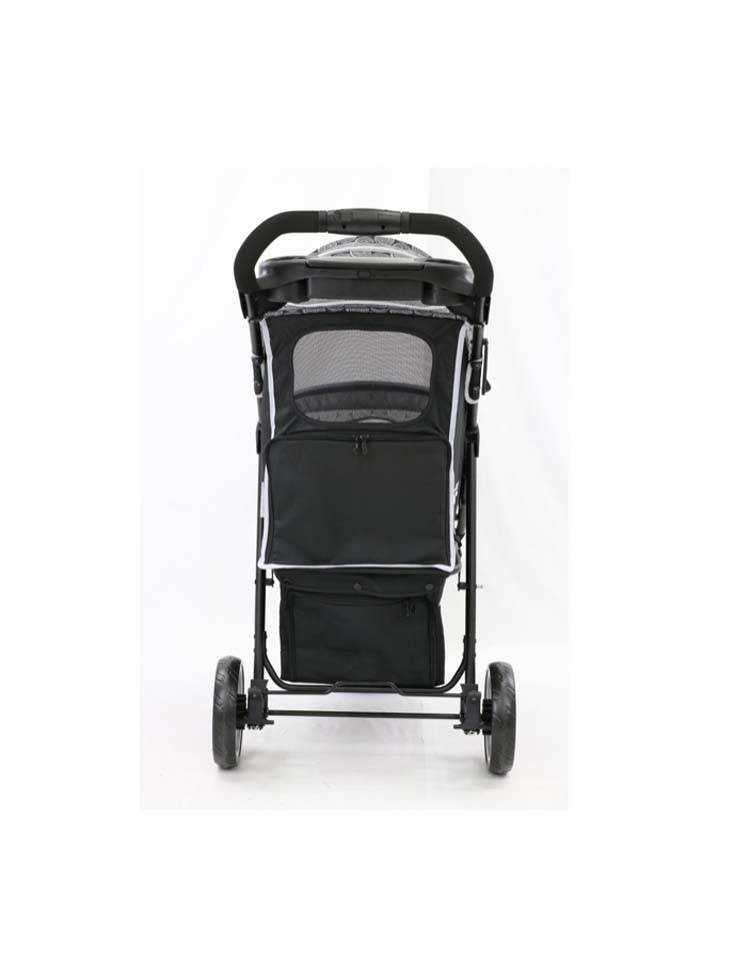 Een hondenbuggy in grijs, geschikt voor honden tot 20 kg, die ook opgevouwen kan worden. Voorzien van vele luxe extra’s.