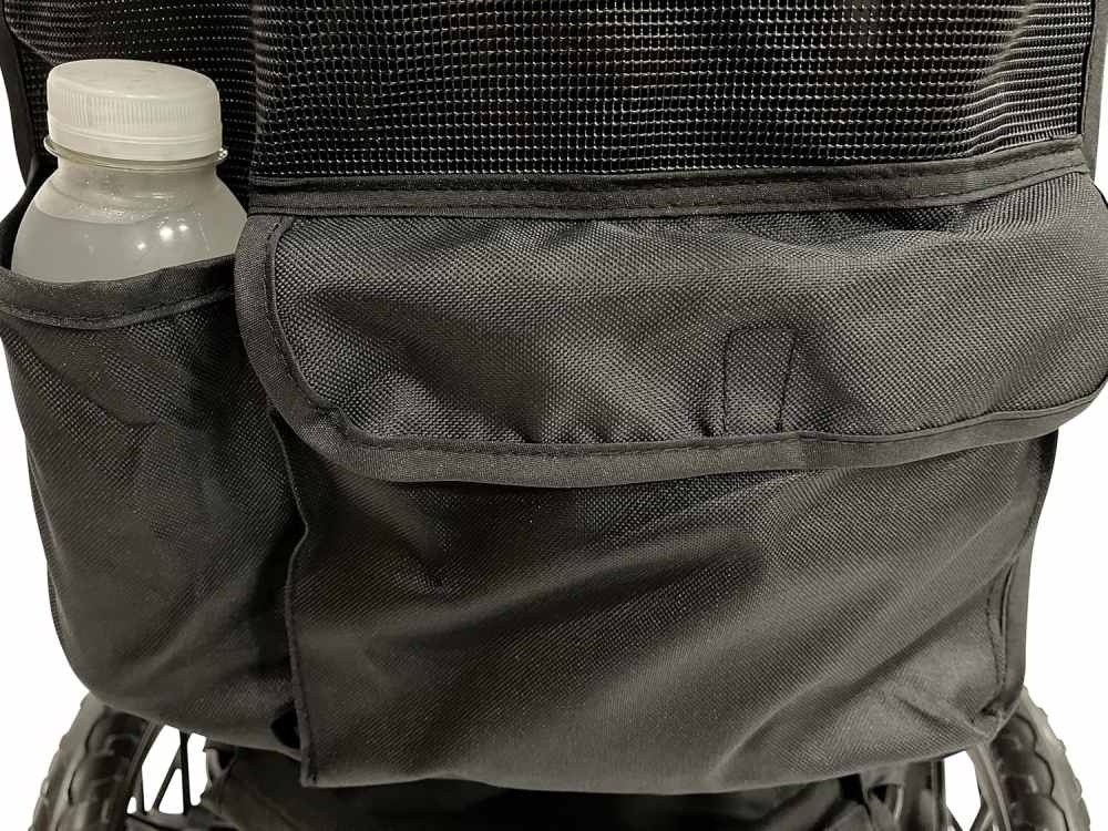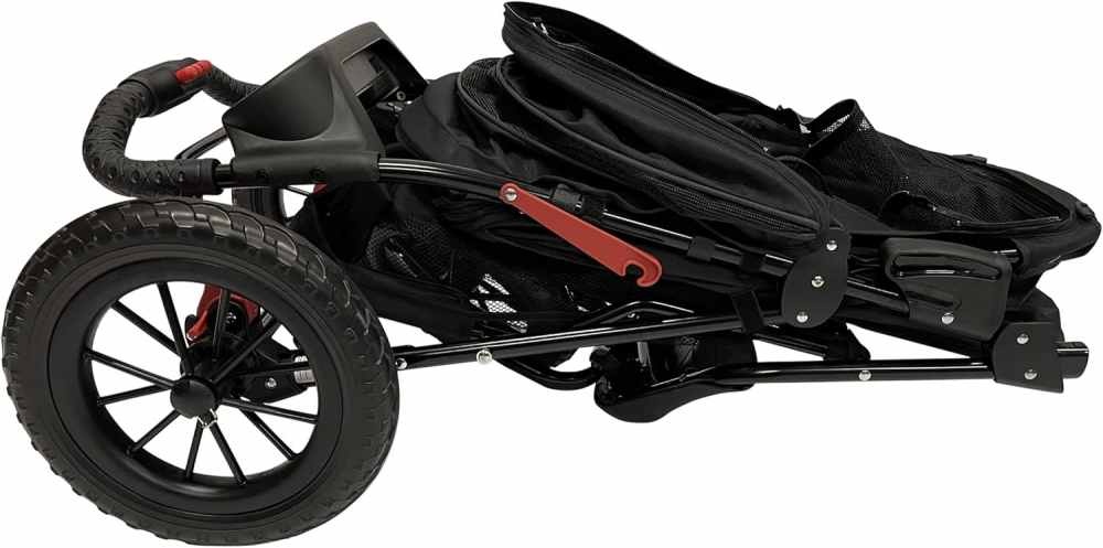 Een zwarte hondenbuggy die geschikt is voor honden tot 23 kg. De buggy kan simpel worden opgevouwen zodat deze niet veel ruimte in beslag neemt.