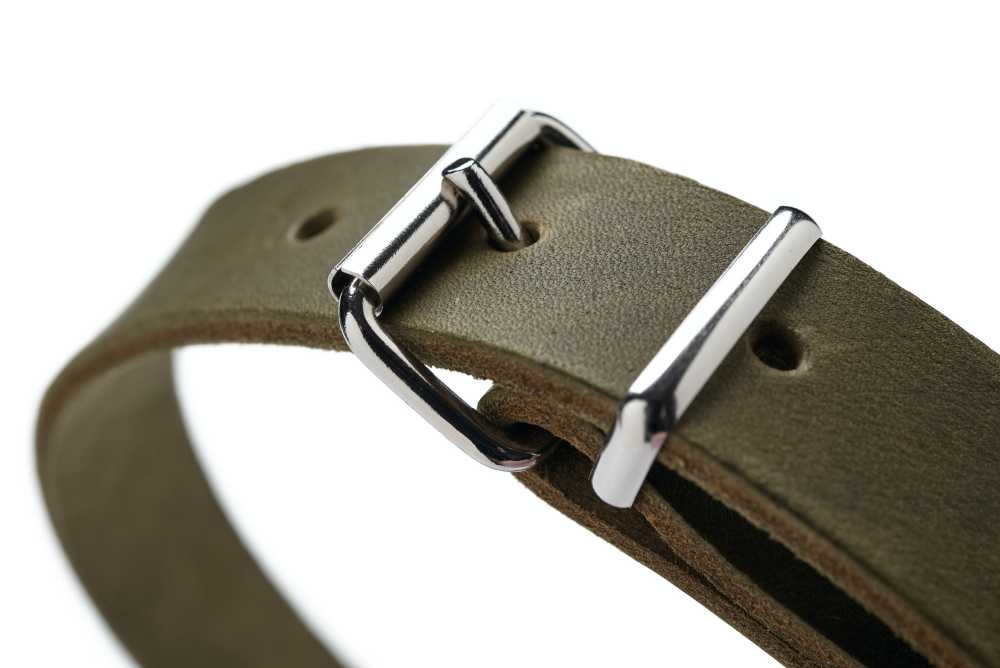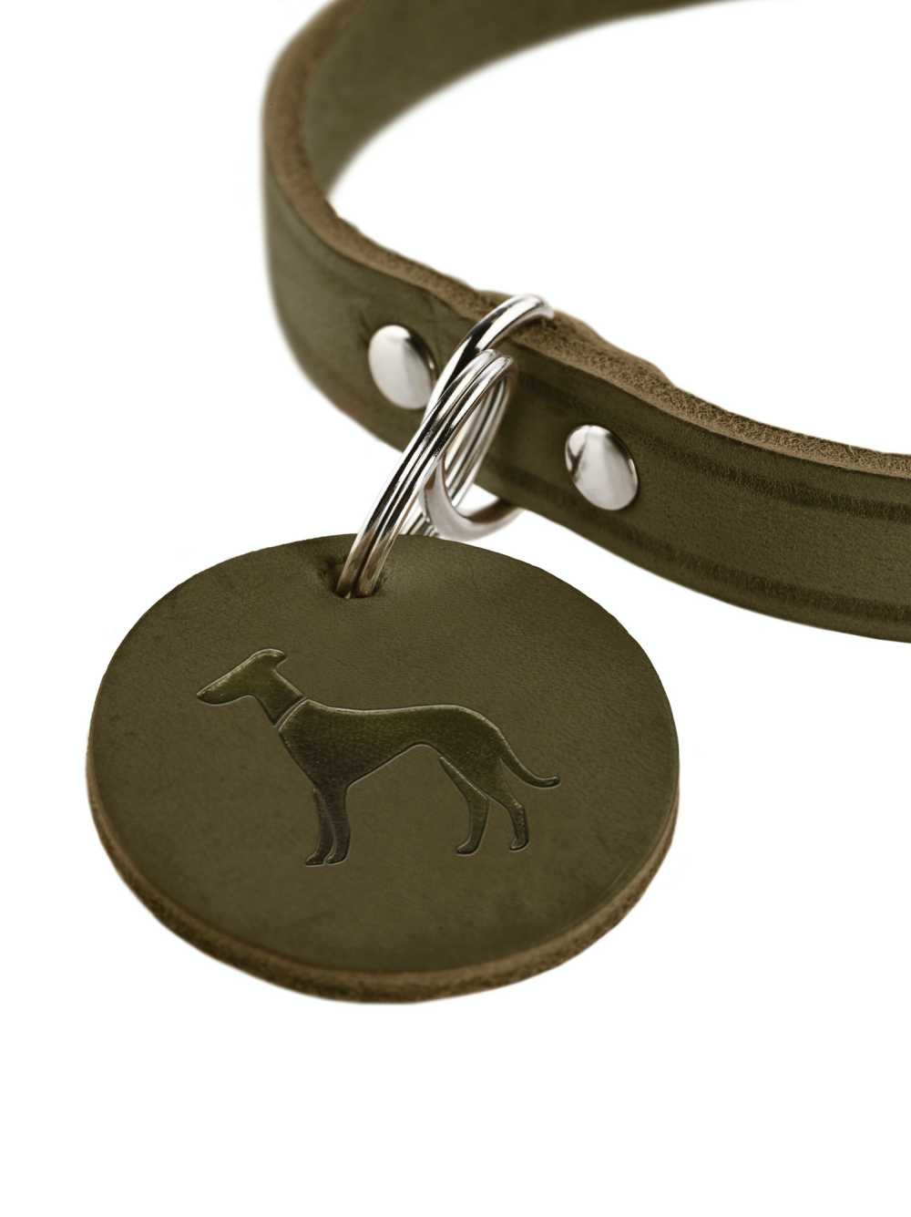 Een elegante donkergroene hondenhalsband, die is gemaakt van duurzaam nappaleer.