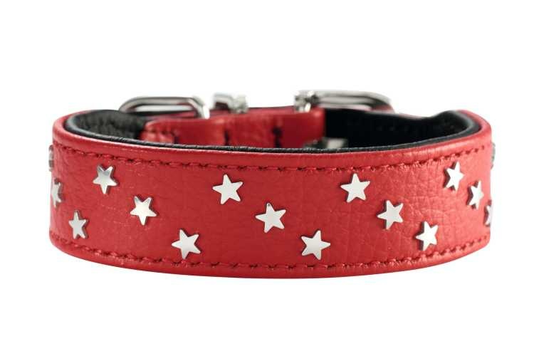 Een opvallende en vrolijke gevoerde rode leren hondenhalsband die is gedecoreerd met sterretjes
