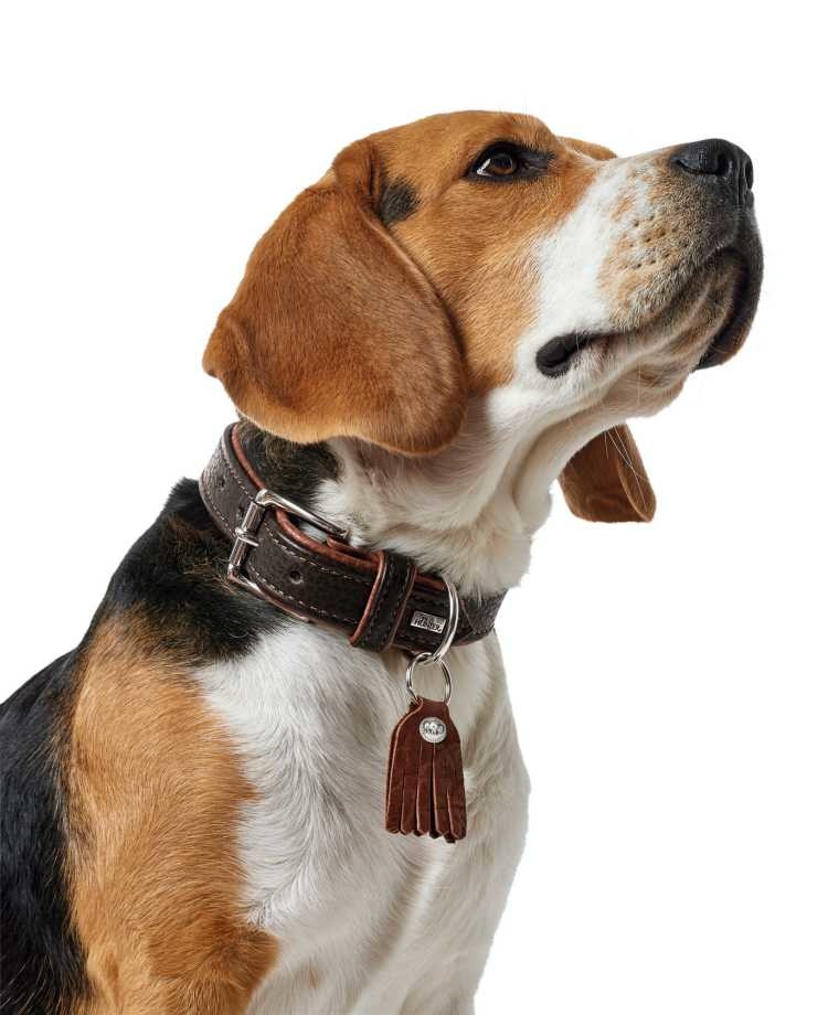 Deze halsband heeft donkerbruin leer aan de buitenzijde en cognac leer aan de binnenzijde. De halsband heeft een afneembaar hangertje dat is voorzien van een bizon motief.