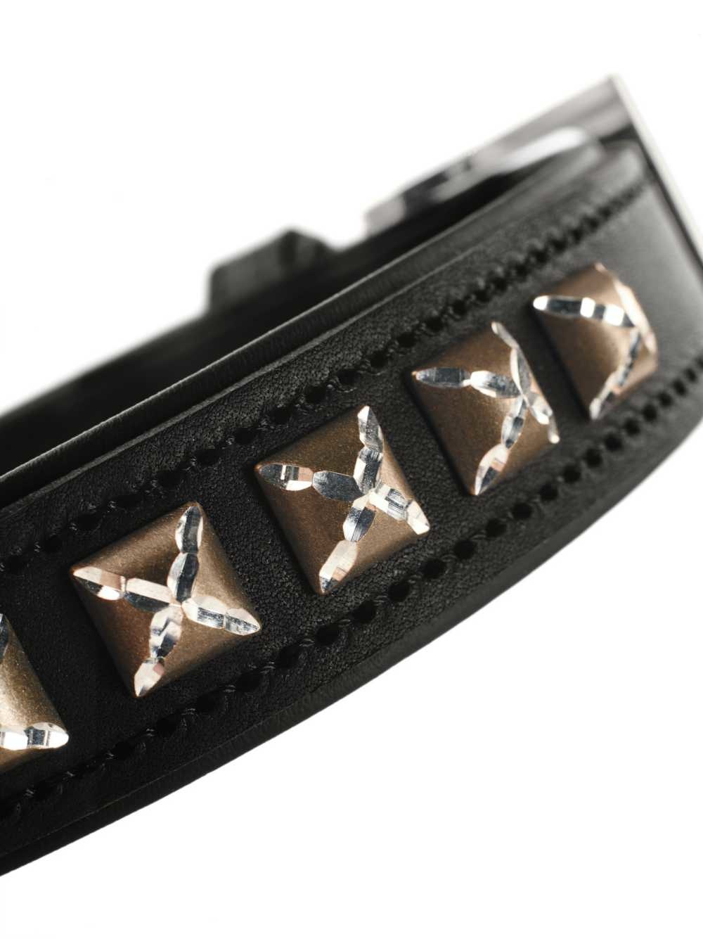 Deze strakke hondenhalsband is gemaakt van 100% hoogwaardig rundleder. De halsband word gekenmerkt door strakke lijnen, een metalen D ring en sluiting waarbij het ontwerp duidelijk is geïnspireerd door Scandinavisch design. Een echte blikvanger zijn de piramidevormige studs. De halsband is gevoerd met zwart leer.