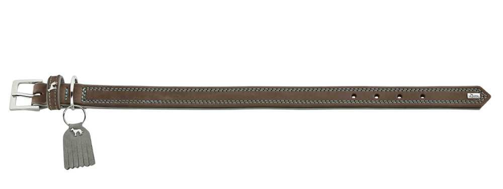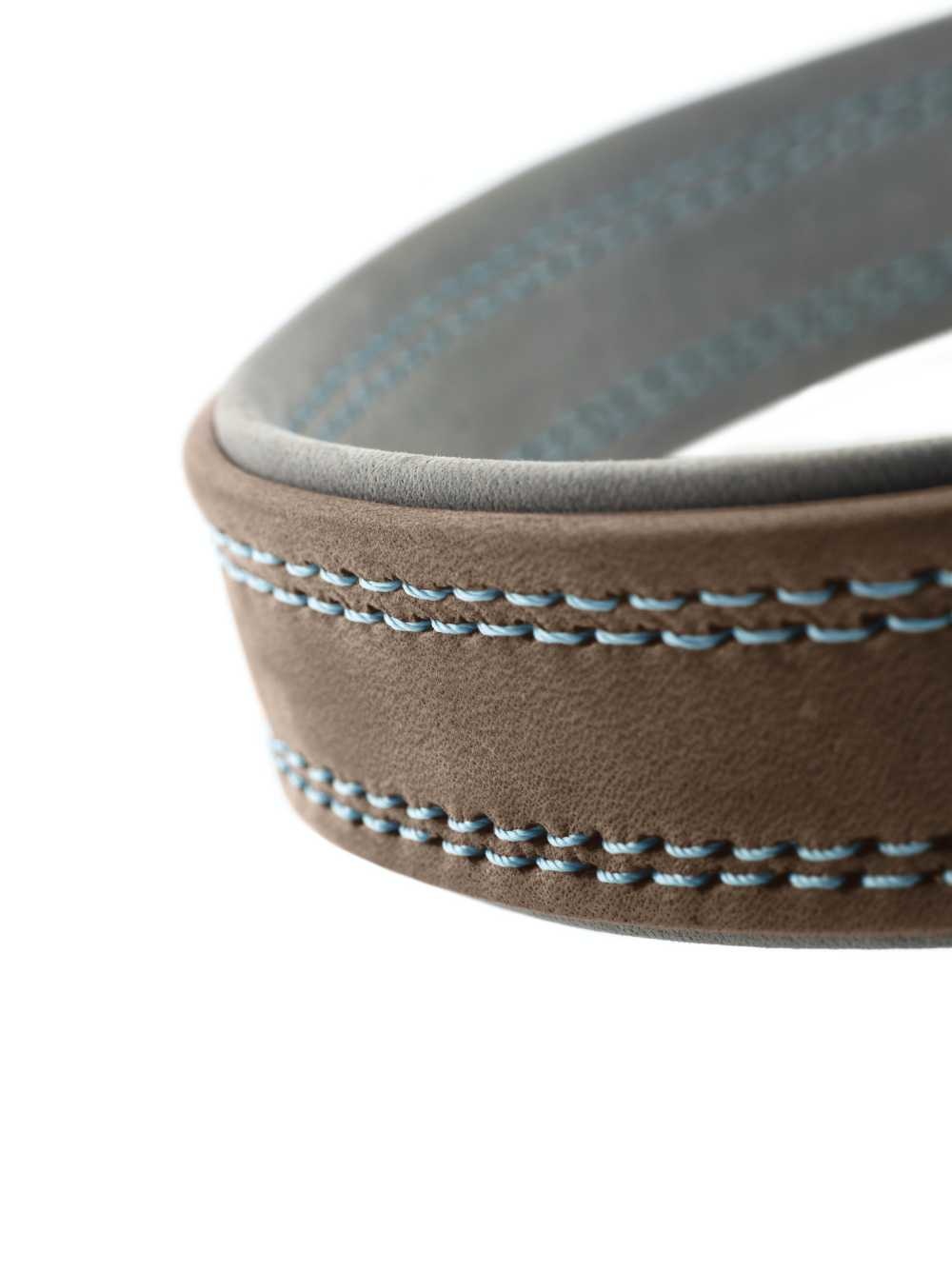 Een mooie walnoot hondenhalsband van zeer zacht nappa rundleer met grijze stiksels en een grijze voering.