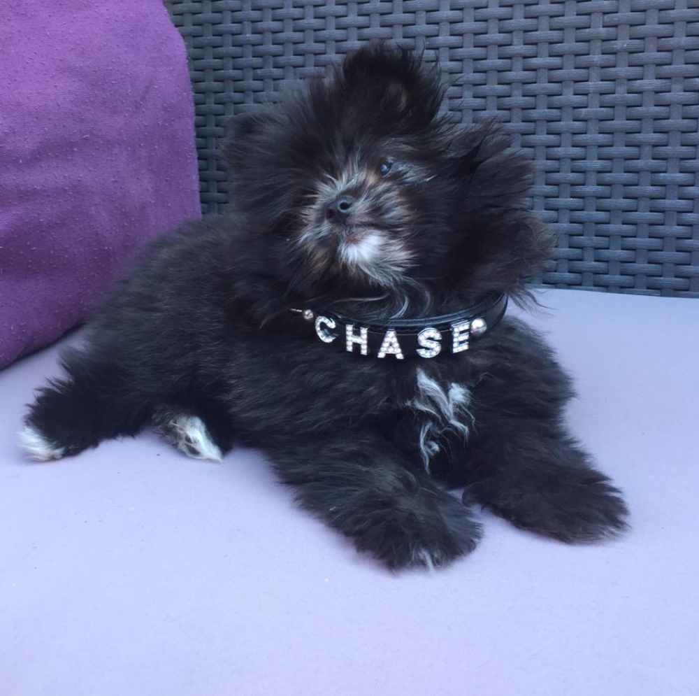 Een zwarte hondenhalsband waarop de naam van de hond wordt geplaatst met stras letters. De halsband is uitgevoerd in leer met een voering van zacht kalfsleer.