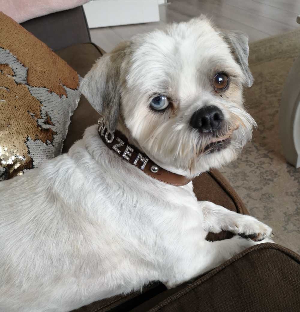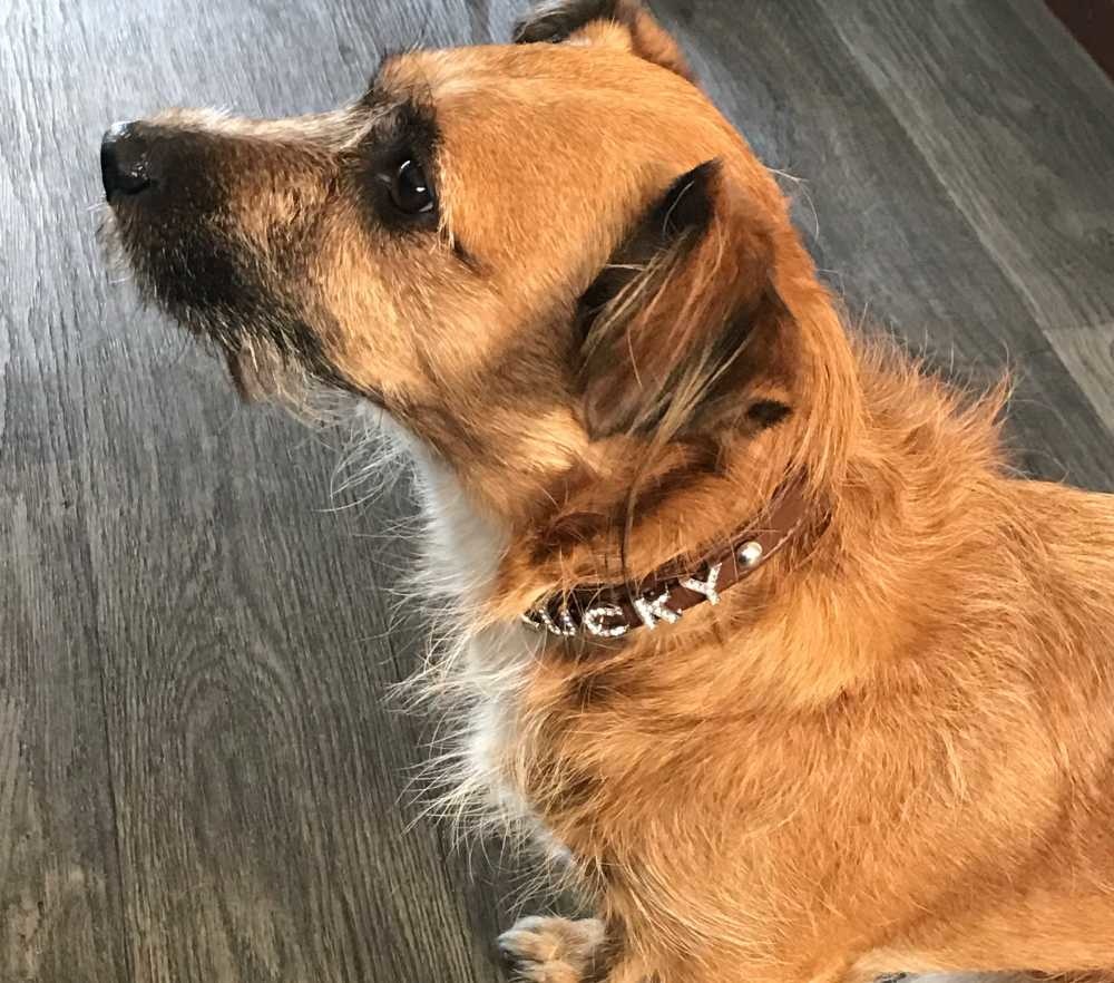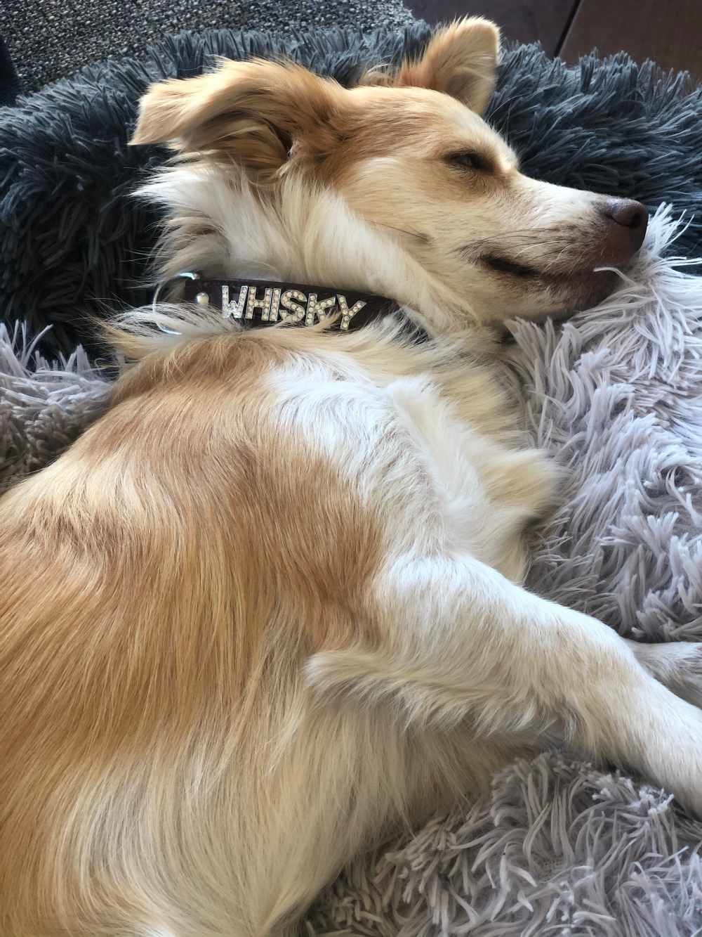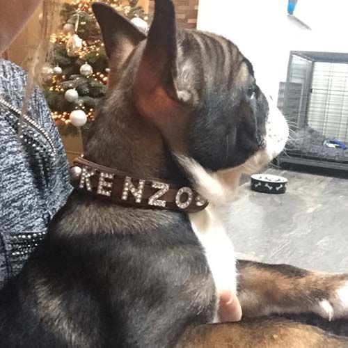 Een bruine hondenhalsband waarop de naam van de hond wordt geplaatst met strass letters. De halsband is uitgevoerd in leer met een voering van zacht kalfsleer.