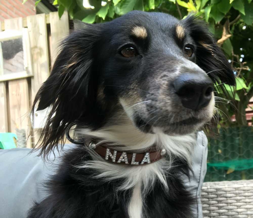 Op deze hondenhalsband is er plaats voor een naam van maximaal 7 letters. De letters worden door ons op de halsband geplaatst ! Als u een decoratief element toe wilt voegen (een kroontje of een pootje), kunt u per element 2 letters minder plaatsen daar deze elementen ongeveer tweemaal zoveel plaats innemen als een letter. Een kroontje of een pootje dient u apart toe te voegen aan uw bestelling.