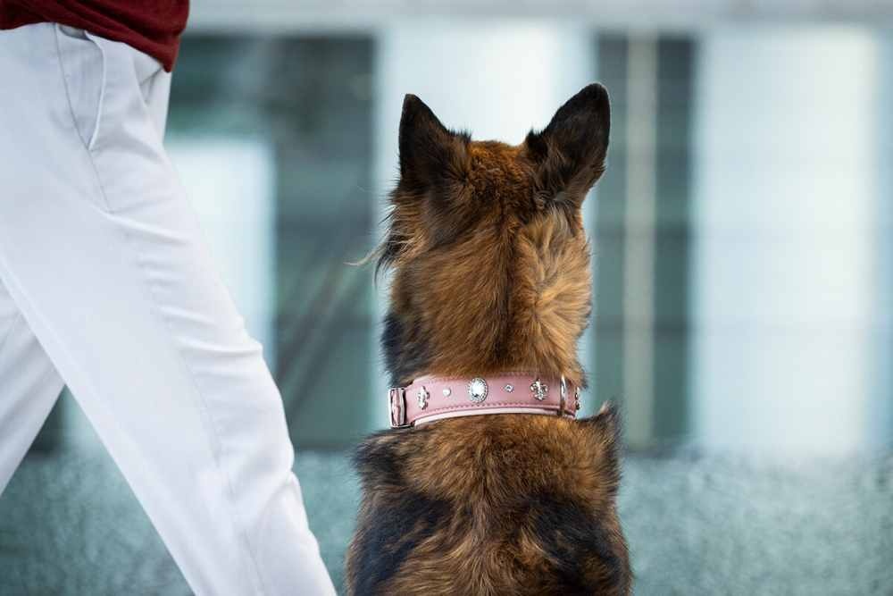 Een schitterende oudroze leren hondenhalsband van dubbellaags nappaleer. Voorzien van diverse verfijnde decoraties en een zilverkleurige gesp en D ring. In vele maten leverbaar. Handgemaakt in Duitsland.