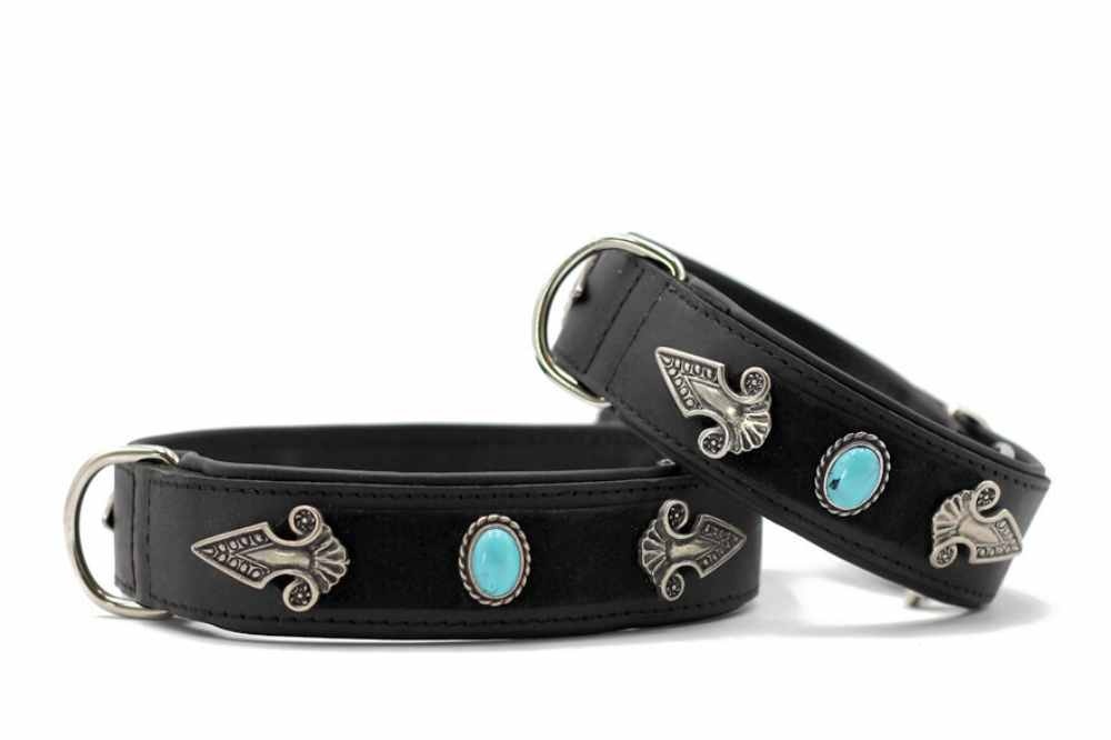 De halsband is verfraaid met stijlvolle applicaties, waaronder een pijlpunt en een cabochon-steen in een bijpassende zetting met een turquoise steen, die het ontwerp een verfijnde touch geven. De kleurrijk afgestemde stiksels maken het geheel perfect af en benadrukken de edele uitstraling van de halsband.