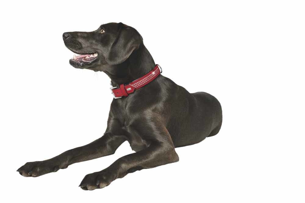 Een effen rode hondenhalsband van onderhoudsarm zacht kunstleer. De halsband is fraai gedecoreerd met drie rijen stras steentjes. In vele maten leverbaar.