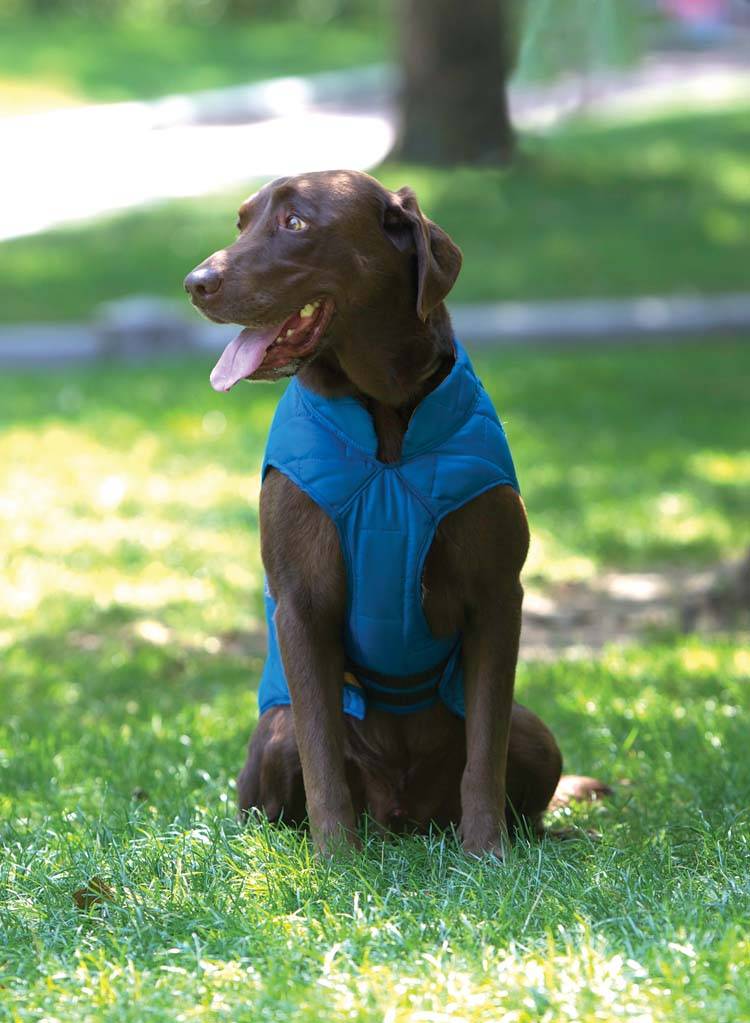 Een waterafstotende jas, die aan twee kanten kan worden gedragen, waarmee de hond zich goed kan bewegen.