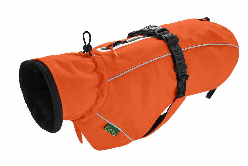 Een lichtgewicht, waterafstotende functionele jas voor honden met verwarmende fleecevoering. De jas heeft