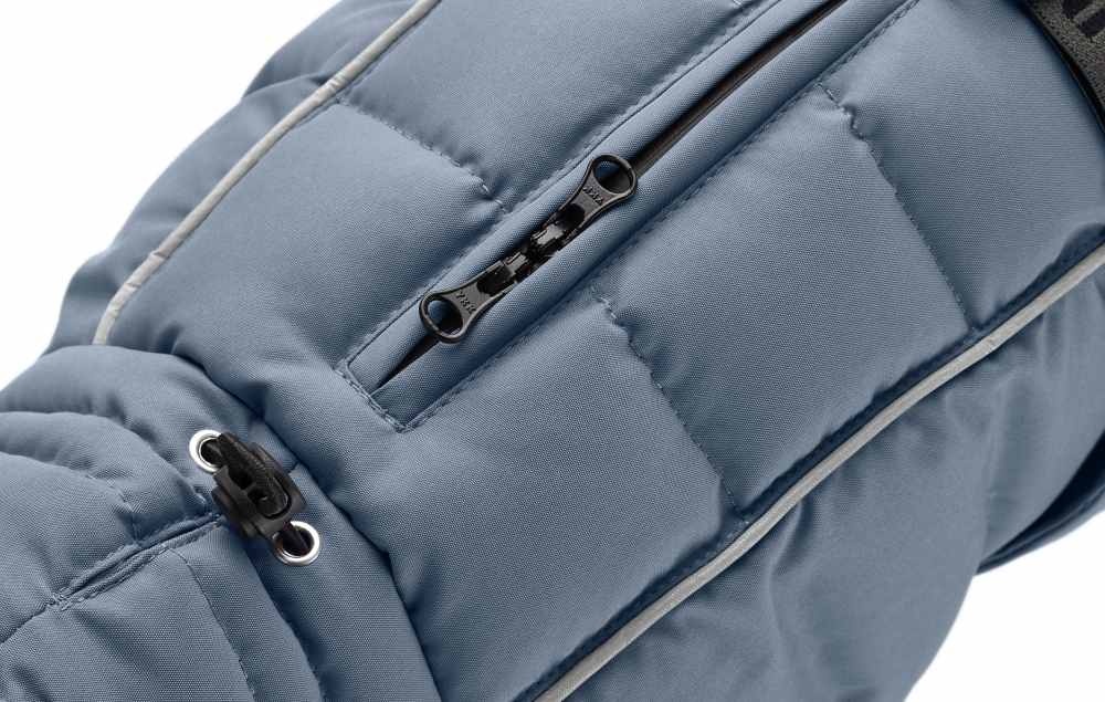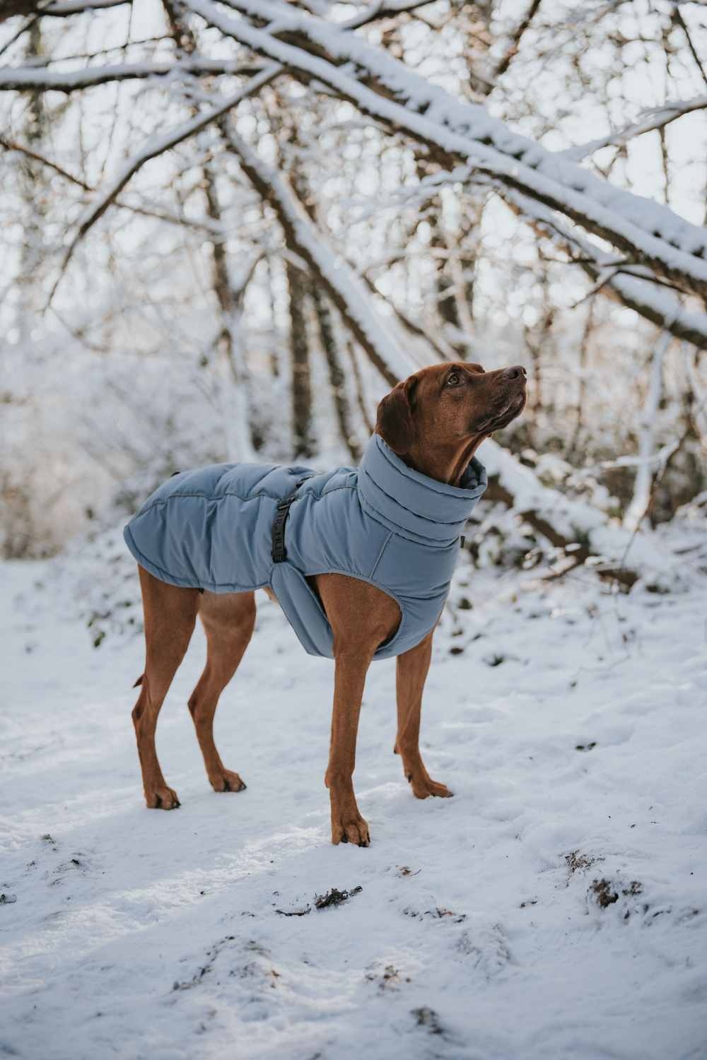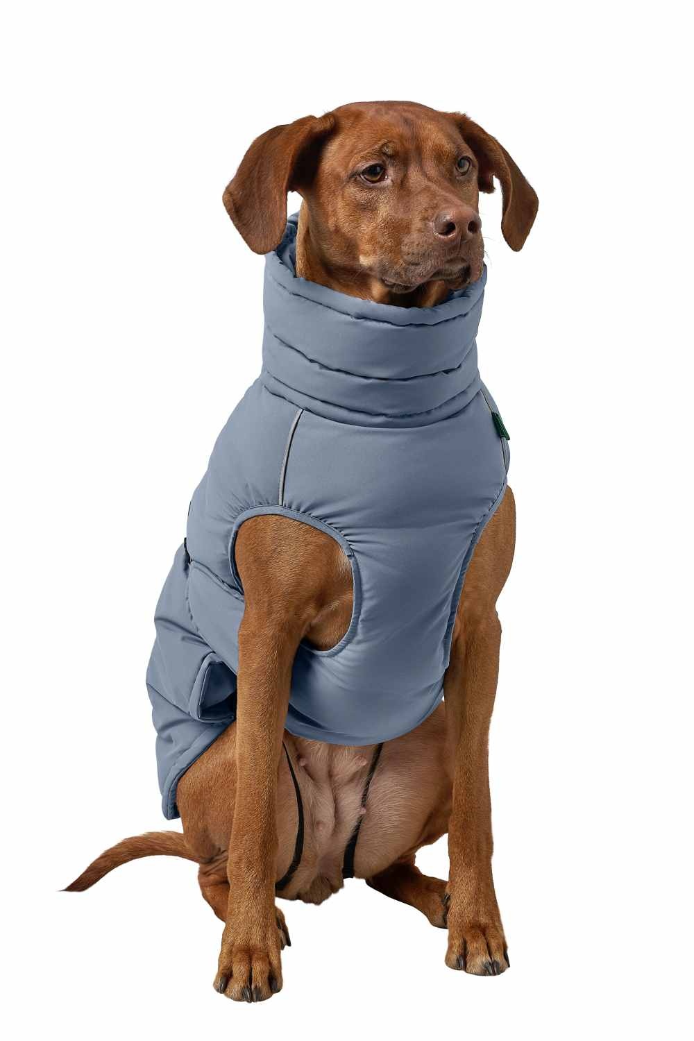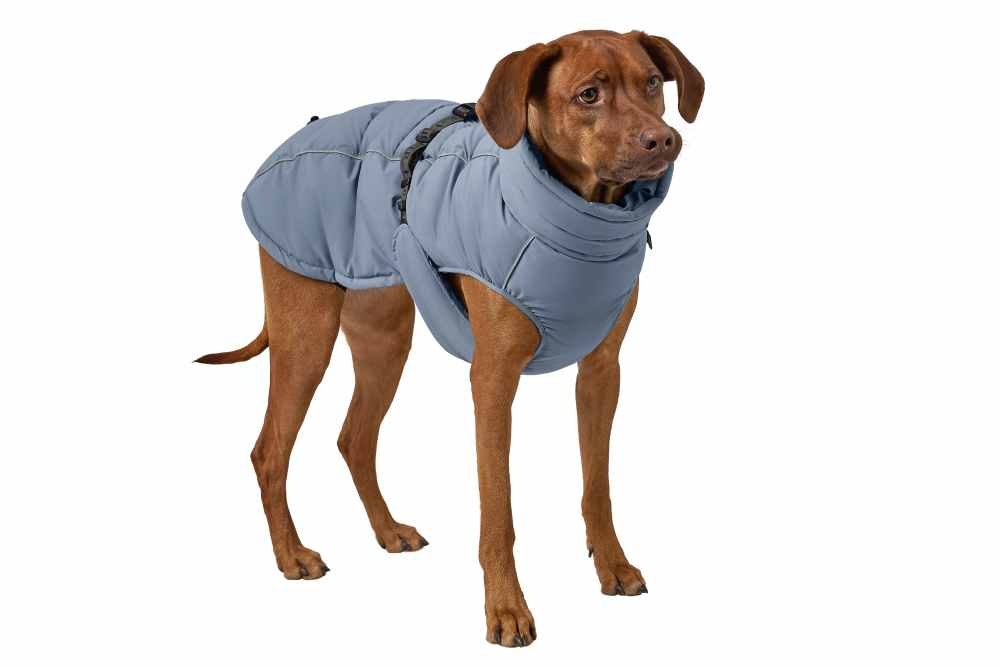 Een gewatteerde en waterafstotende functionele jas voor honden met dikke voering. De jas heeft