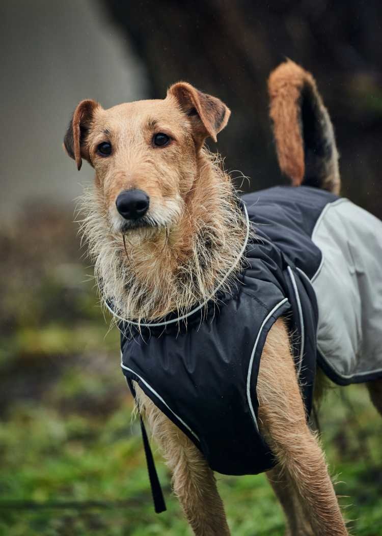 Een waterafstotende winddichte zwarte / grijze hondenjas met reflecterende biezen en 3M isolerende voering. In vele maten leverbaar.