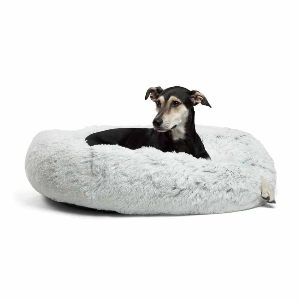 Een ronde hondenmand in de vorm van een donut, van zeer zachte stof, met een unieke vulling. Leverbaar in verschillende maten.