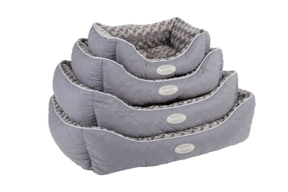 Deze fraaie grijze hondenmand is gewatteerd en gestikt in een ruit patroon. Het liggedeelte is afgewerkt met zachte pluche imitatiebont zodat de mand heerlijk zacht en comfortabel is. De mand is voorzien van biezen rond het slaapgedeelte. Een mooi detail is het Scruffs logo aan de voorzijde van het hondenkussen.