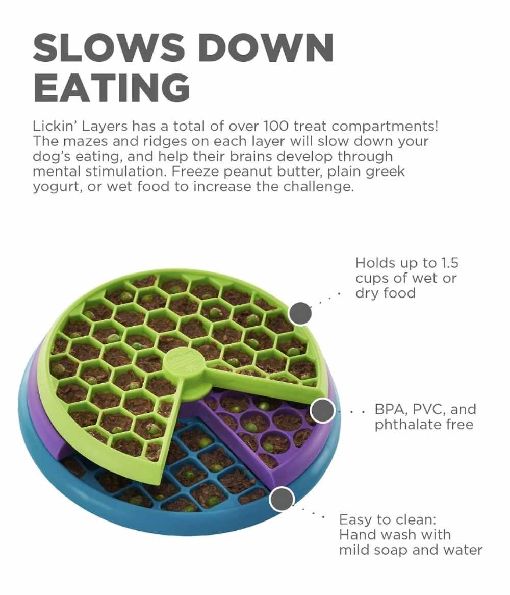 Verbeterde Spijsvertering Naast het verstrekken van geestelijke en fysieke uitdagingen, fungeert de Lickin’ Layers ook als een langzame voeder. De doolhoven en richels op elke laag dwingen je hond om langzamer te eten, wat de spijsvertering kan verbeteren en overeten kan voorkomen.