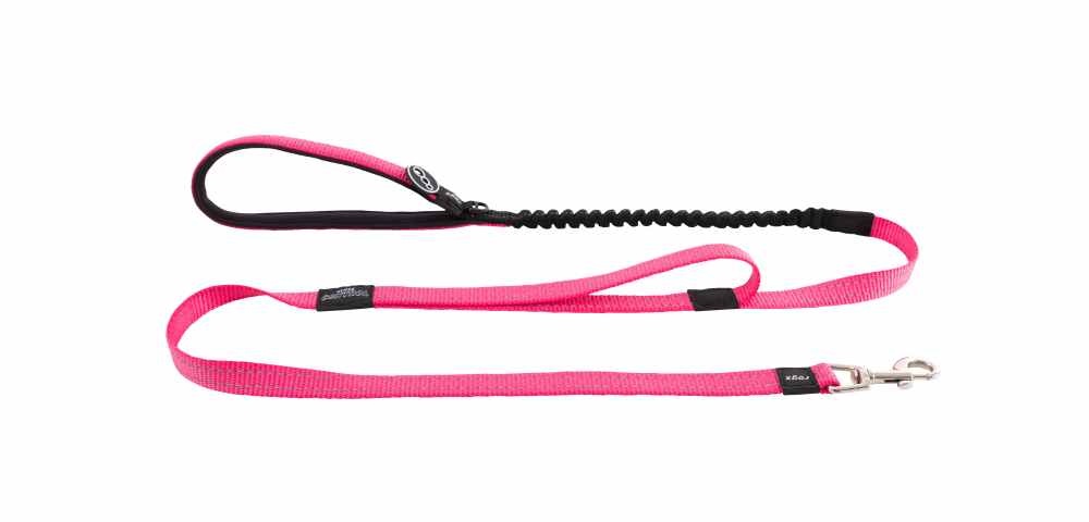 Een stevige effen roze nylon hondenriem met een musketonhaak, voorzien van reflecterende stiksels. De riem heeft een elastische band voor schokabsorptie. In diverse maten leverbaar.
