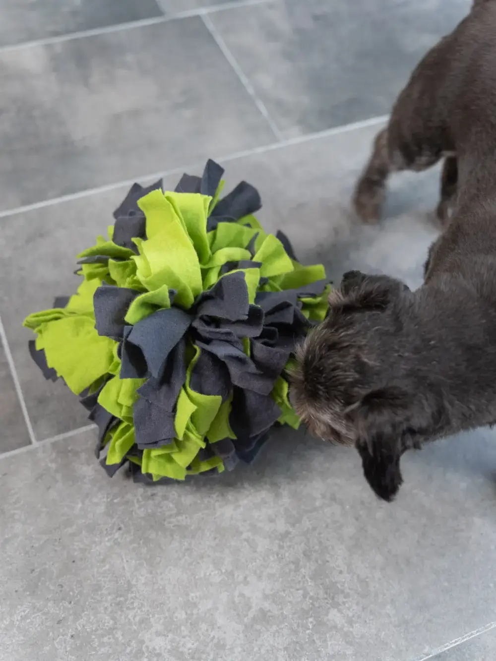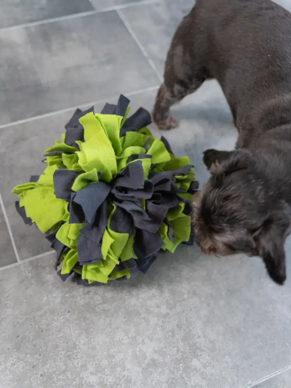 Een interactief speeltje, een bal van fleece, waarin u wat lekkers verstopt voor uw hond. Deze kan dan aan de slag om de snacks te vinden. Hoe dieper deze erin gestopt zijn, hoe uitdagender de puzzel is voor uw hond !