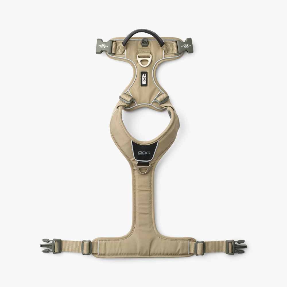 Een comfortabel en sterk beige hondentuig, voor de actieve hond, met een zachte voering en een ergonomisch ontwerp. (Versie 2024).
