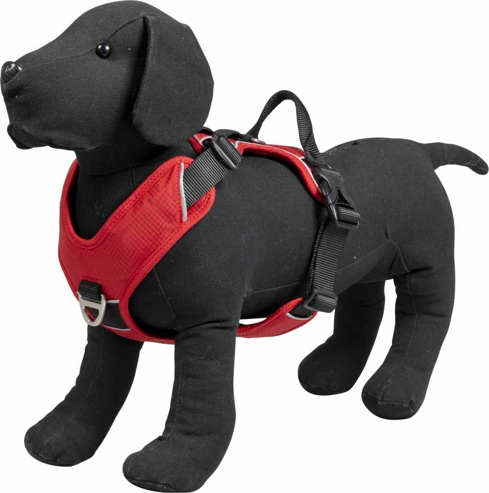 Een comfortabel en lichtgewicht rood hondentuig, een ergonomisch instapmodel dat perfect aangepast kan worden aan de lichaamsvorm van de hond. Het heeft reflecterende elementen voor extra zichtbaarheid. Het tuigje is voorzien twee bevestigingspunten.