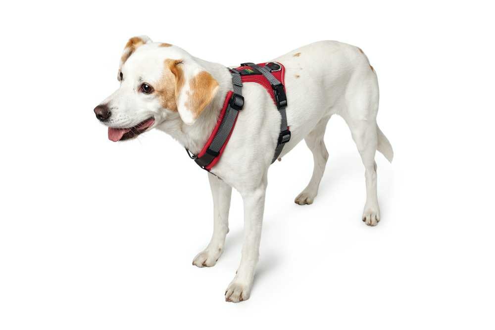 Een gevoerd rood Y hondentuig met een uitstekende pasvorm dat u op vier plaatsen kunt verstellen.