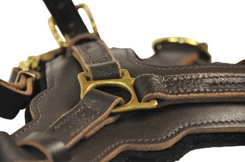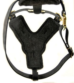 Een stoer en zeer hoogwaardig leren hondentuig voor de grotere hondenrassen. De borstplaat is in de vorm van een Y waardoor de druk op de keel wordt weggeleid naar de schouders. De borstplaat is gemaakt van dik leer dat geschikt is voor zware belasting en is gevoerd met dik vilt om schokken op te vangen. De riemen zijn bevestigd aan de borstplaat met stiksels, messing klinknagels en lederen lussen.
