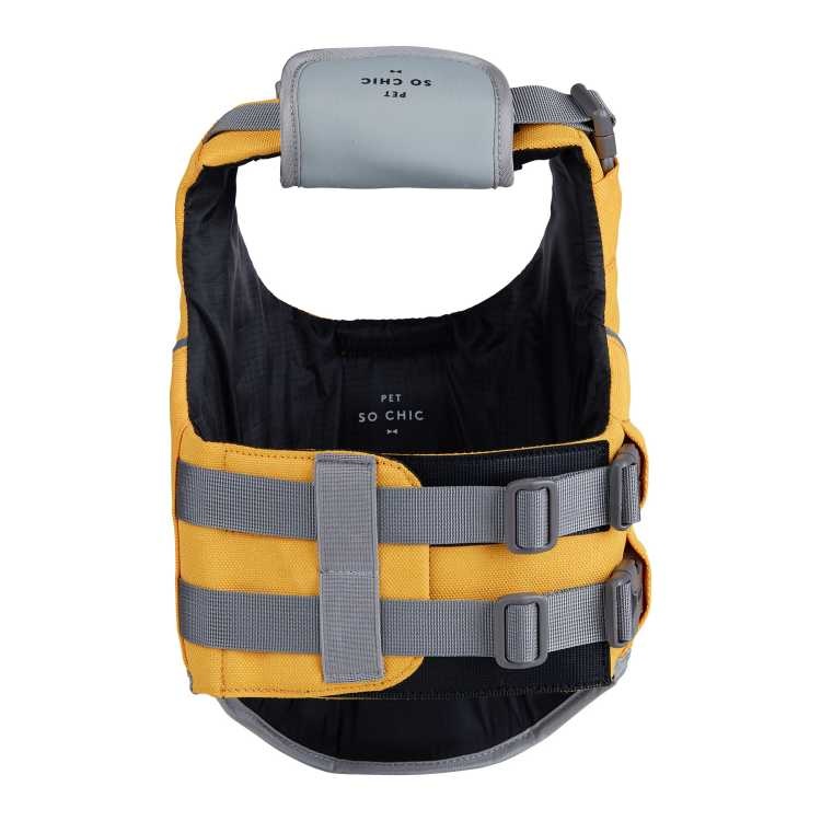 Een prachtig geel hondenzwemvest met een groot drijfvermogen waarmee u veilig met de hond het water op kunt gaan.