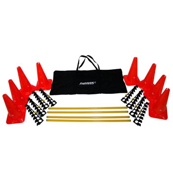Deze prachtige set is geschikt voor agility trainingen en  kunt u gemakkelijk meenemen in de bijgeleverde zwarte nylon draagtas. De set bestaat uit 8 oranje kegels en 4 springstokken. De hoogte van de springstokken kunt u variëren met de 8 bijgeleverde opzetstukken. De minimale hoogte van de springstokken is 5 cm, welke hoogte bijzonder goed geschikt is voor revalidatie. De hoogte is stapsgewijs in te stellen per 5 cm, tot een maximale hoogte van 76 cm.