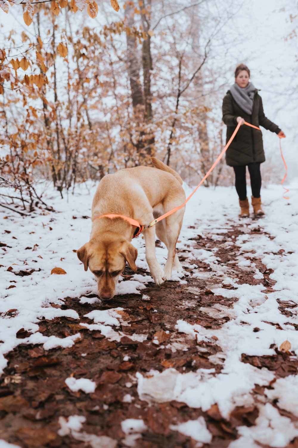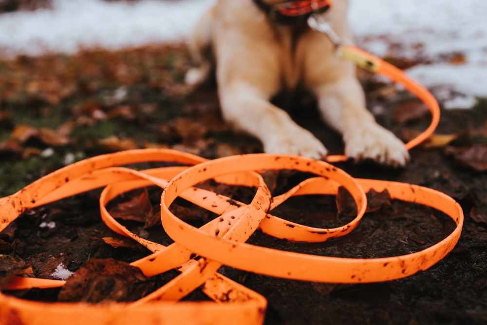 Deze lange oranje jachtlijn is gemaakt van robuust materiaal en speciaal ontwikkeld voor de jacht en hondentraining.
