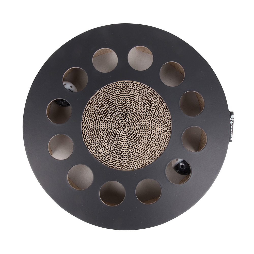 Een zwart rond kartonnen kattenspeeltje waarin een balletje zit verstopt. De kat kan er naar hartelust mee spelen en aan krabben.